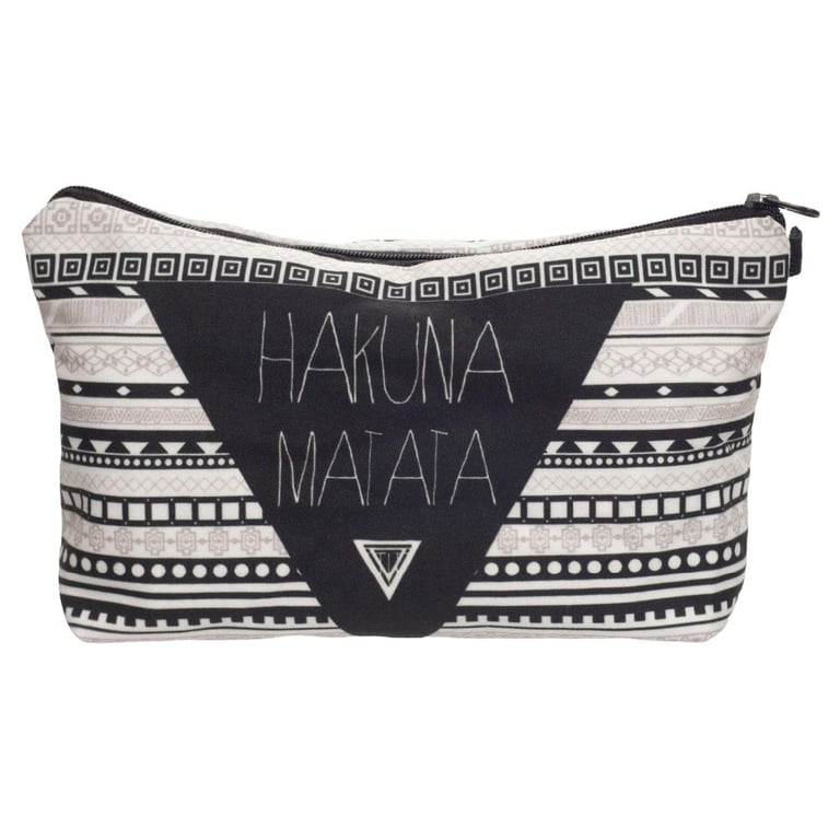 A quality cosmetic bag with the inscription Hakuna Matata is adorned with a beautiful Aztec pattern.