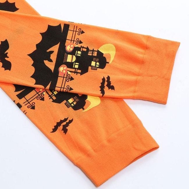 The knee-high socks feature a Halloween print with bats and a spooky house. They are suitable for wearing during autumn, All Souls' Day, and of course Halloween itself.