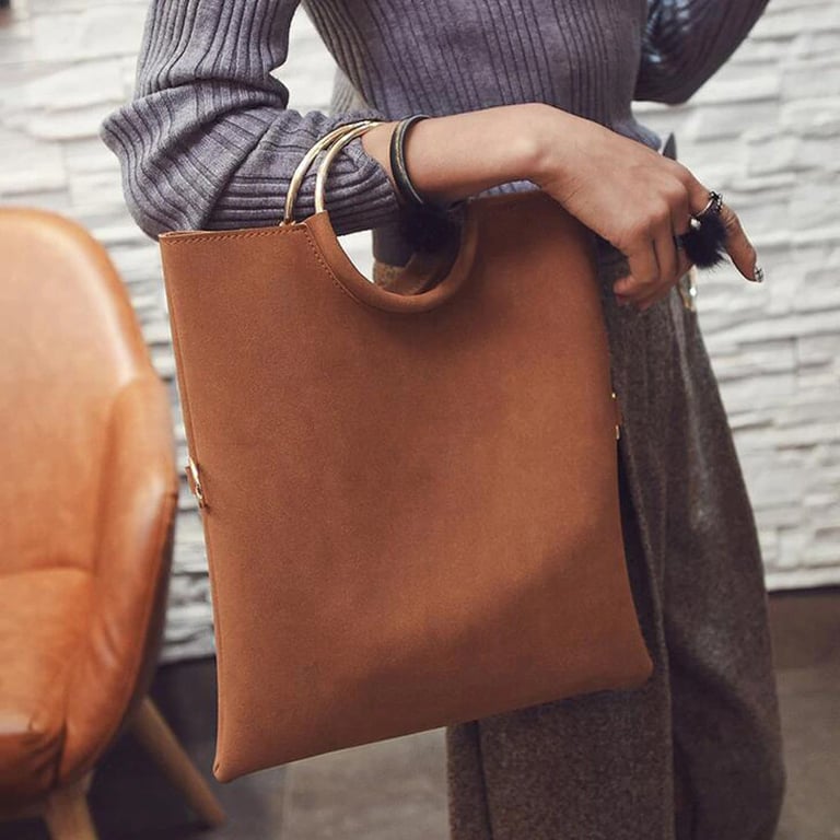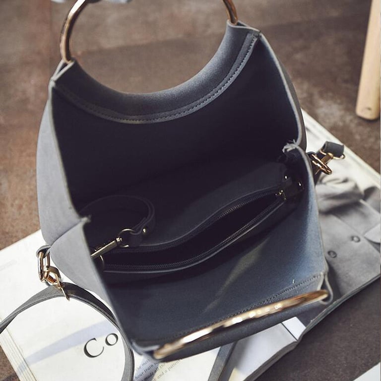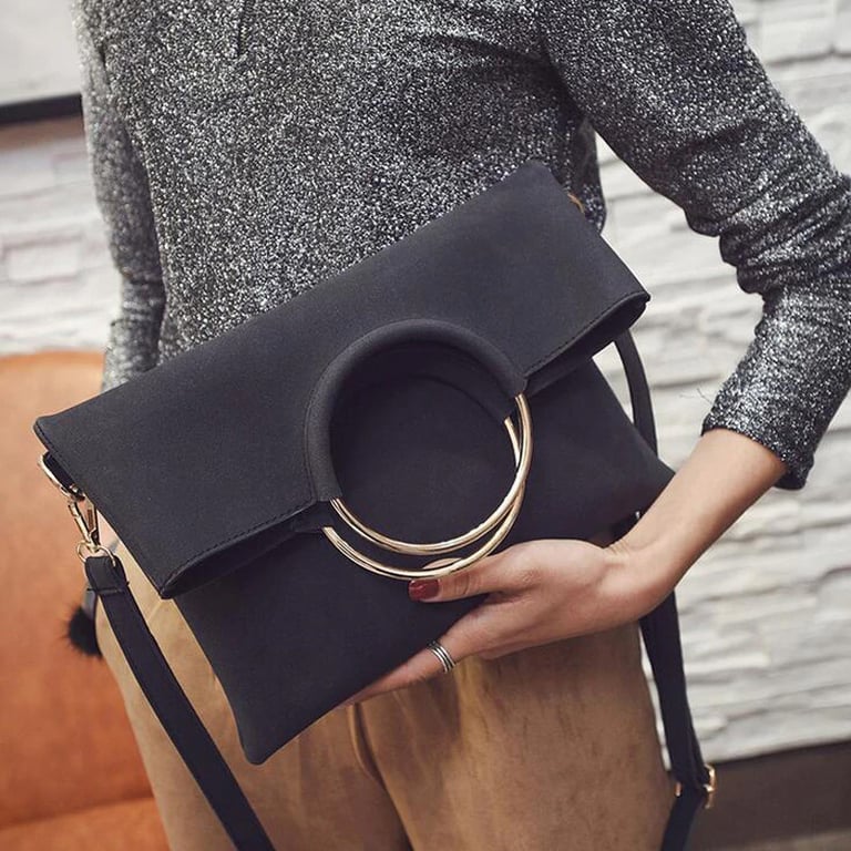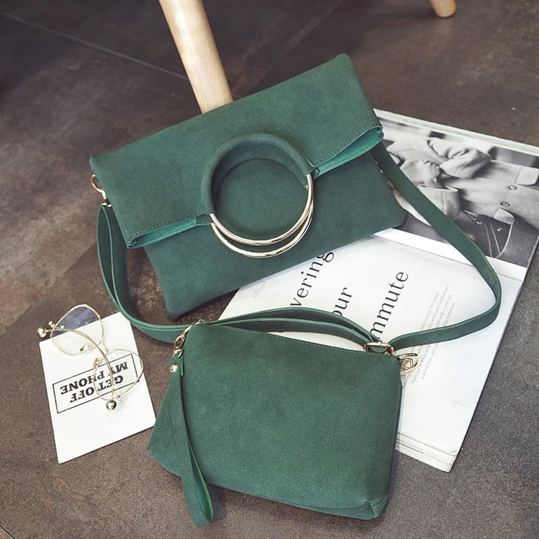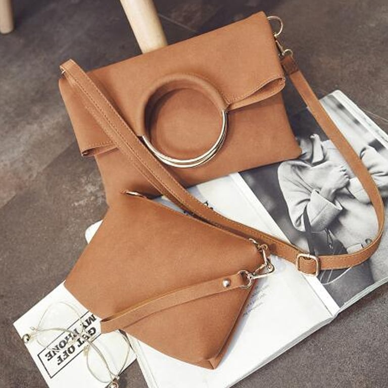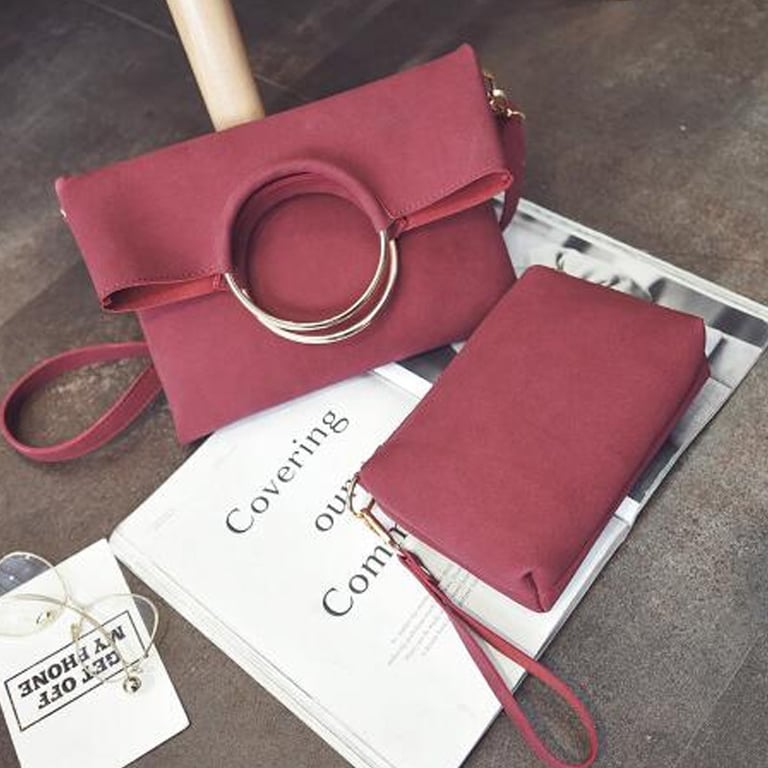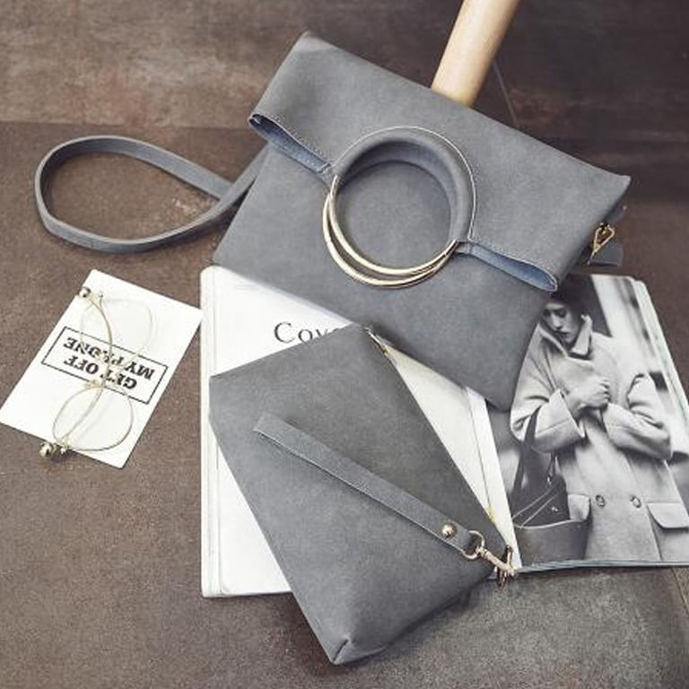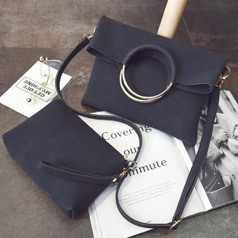 Stylish handbag set with distinctive rings and a practical separate pouch.