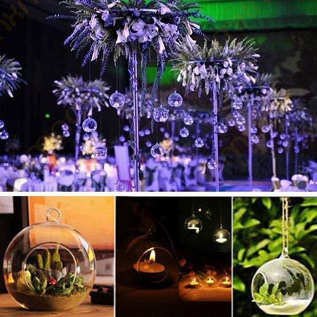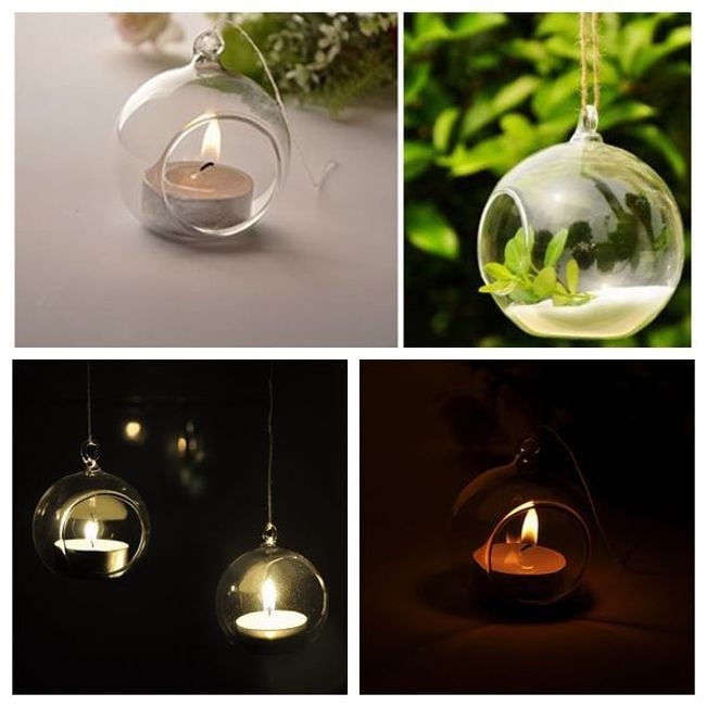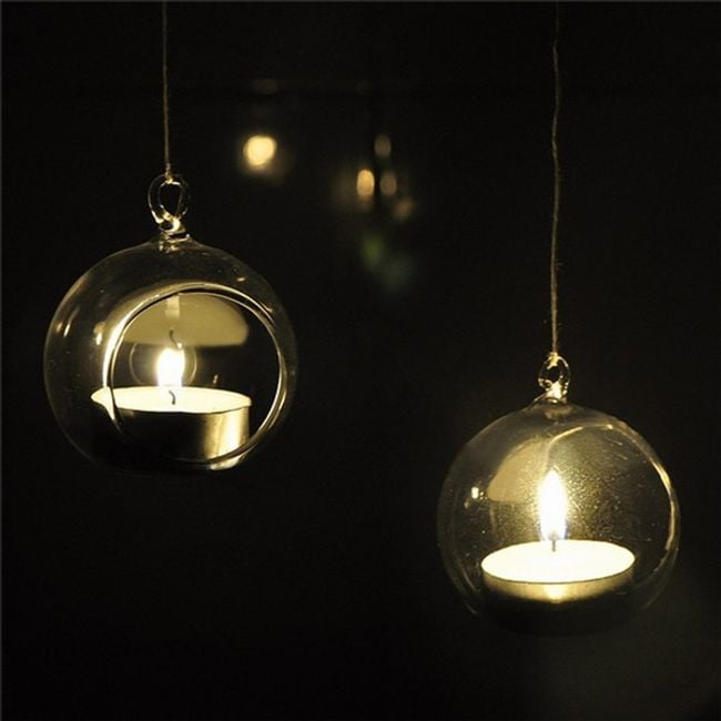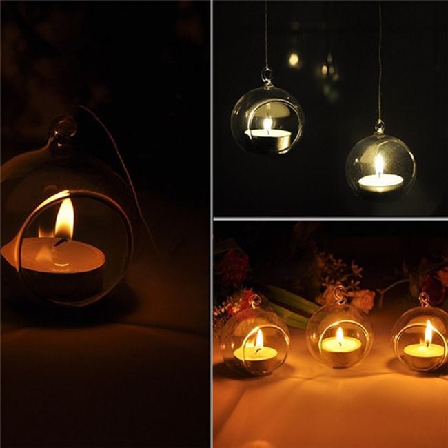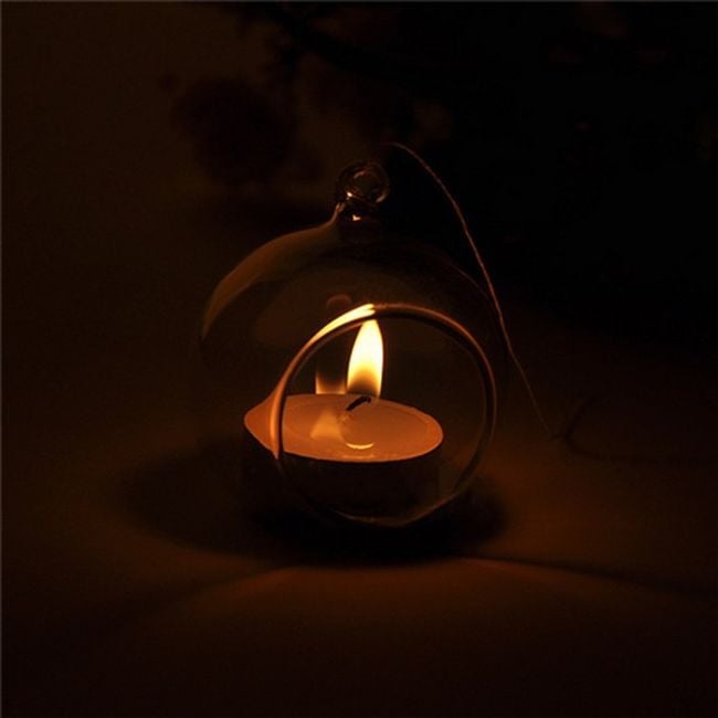 Create a romantic atmosphere at home with this hanging candle holder. The candle holder is made of glass and is transparent. It is suitable for small tea lights.