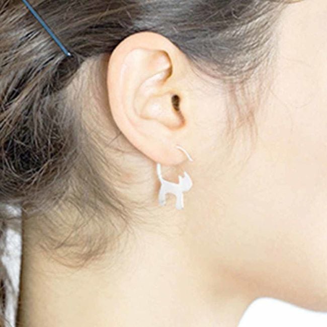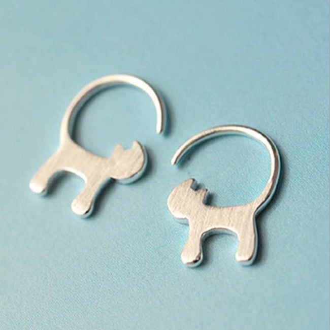 The earrings thread through the back of the ears, have a silver colour and look like a cat from the side. They are suitable for everyday wear as well as social events.