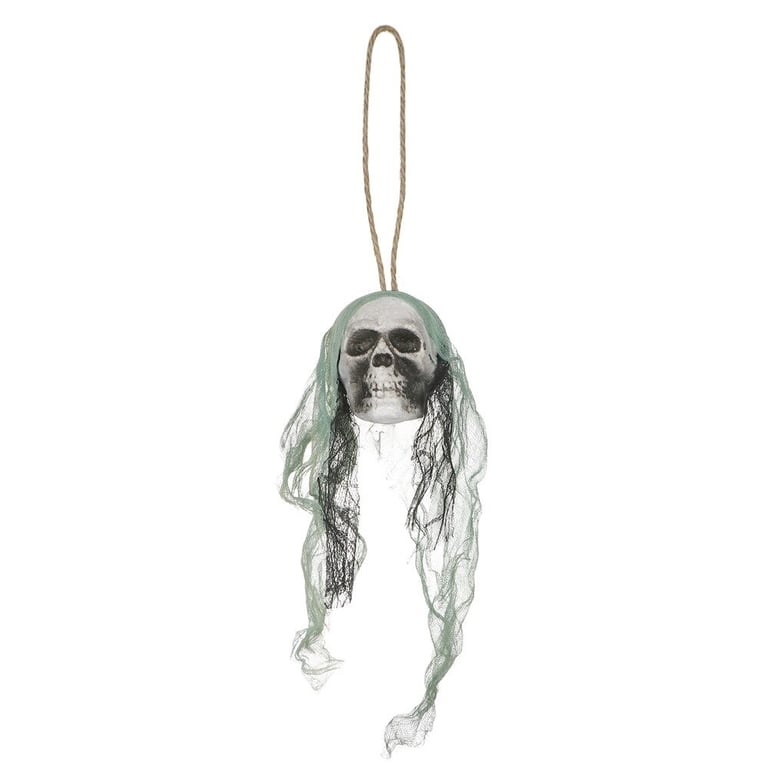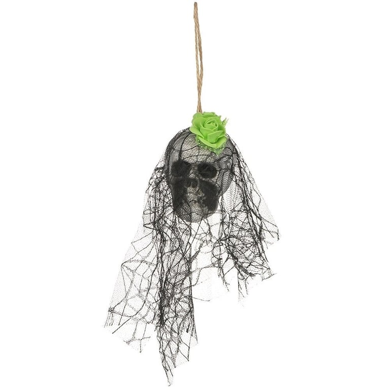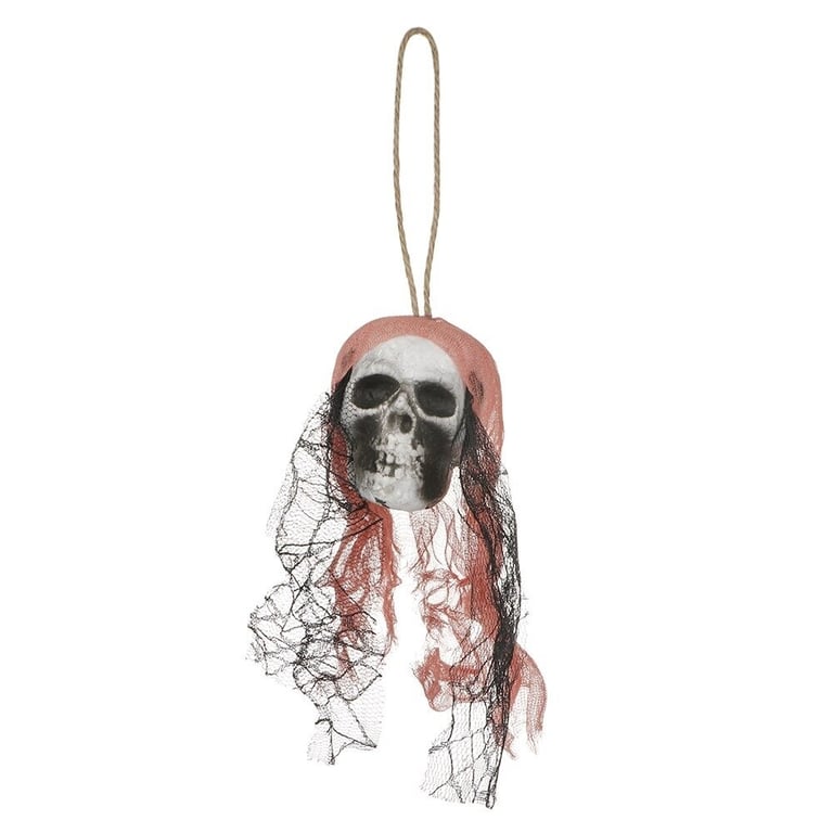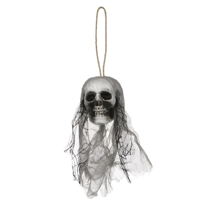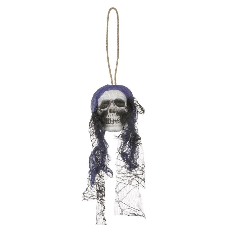 Decorate your Halloween party with a hanging skull. The skull is styled like a dead bride with a veil. Total length 36 cm. Plastic material ensures good quality.