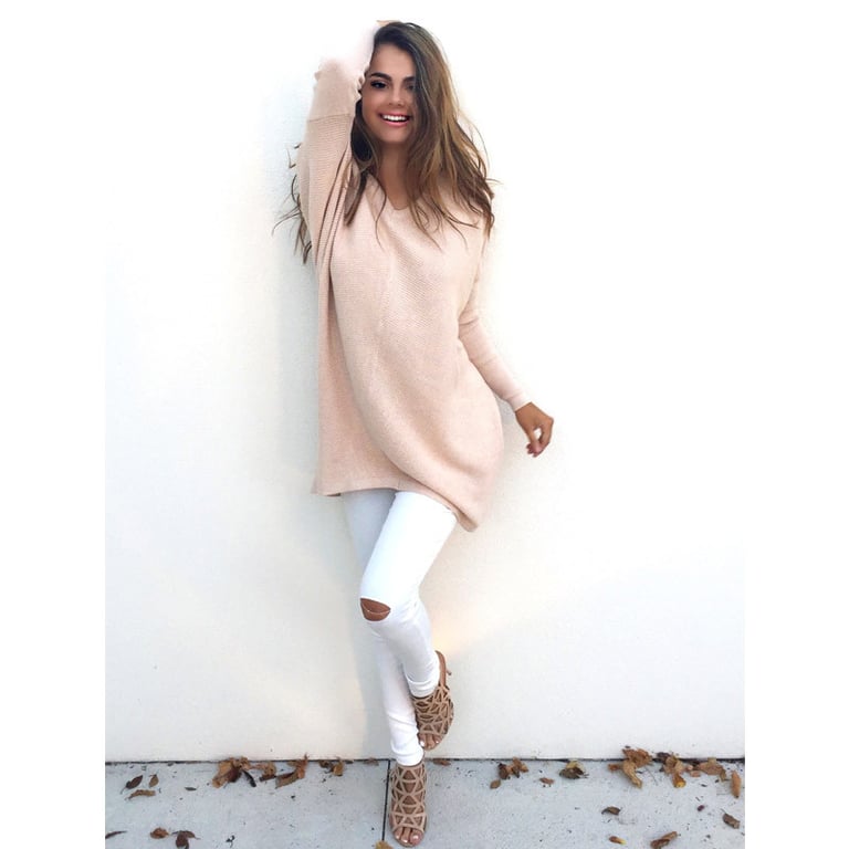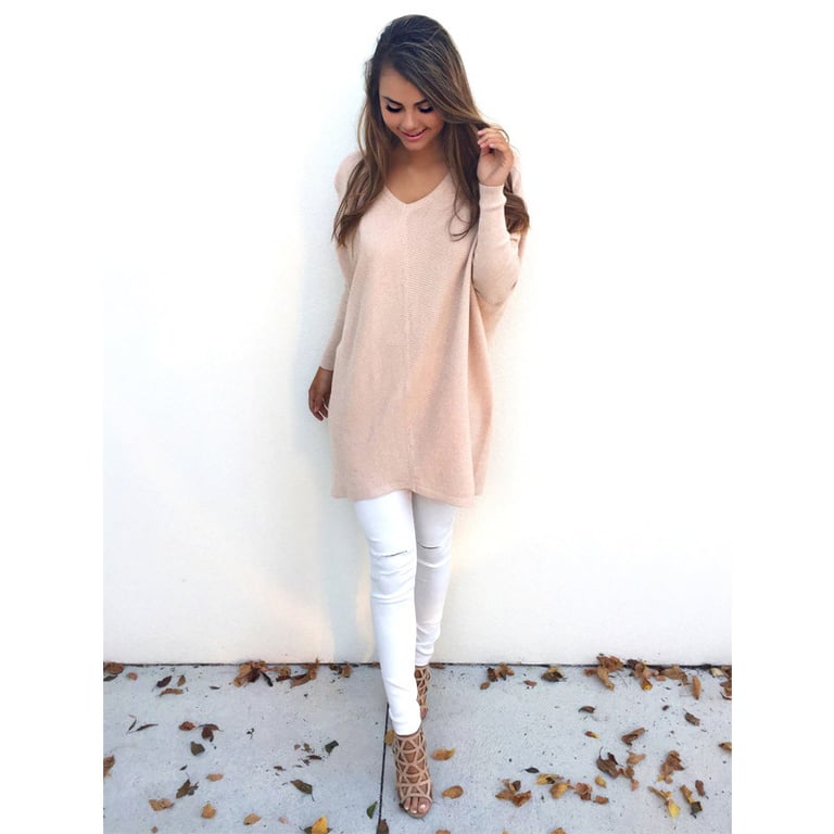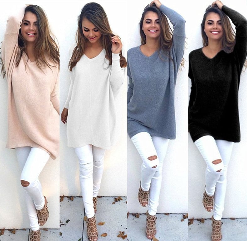 Women's comfortable long loose-fitting sweater with long sleeves and a V-neck. Available in four colour options.
