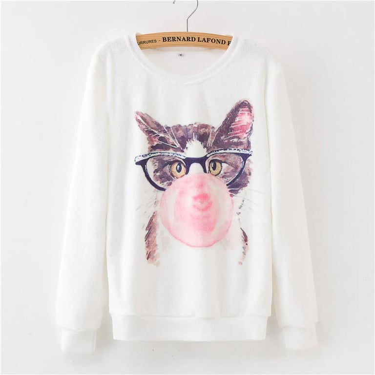 Women's sweatshirt with a colourful print on the front. The sweatshirt has a loose fit with an elastic waistband, long sleeves, and a round neckline.