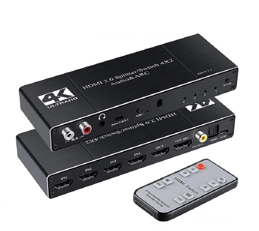 Connectors: 4x HDMI input (female), 2x HDMI output (female), 1x coaxial jack (female), 1x optical output, 1x 3.5mm jack (female), 2x audio jack (female)