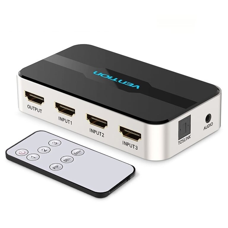 Connectors: 3x HDMI input (female), 1x HDMI output (female), 3.5mm jack (female), TOSLINK (female)