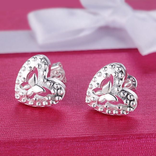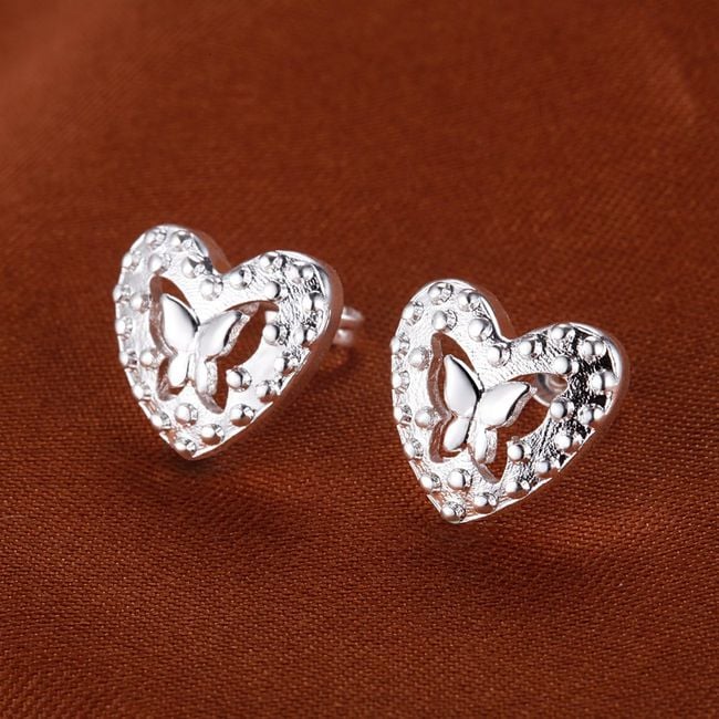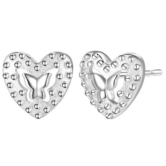 Stud earrings in the shape of hearts feature small butterflies as the design.
