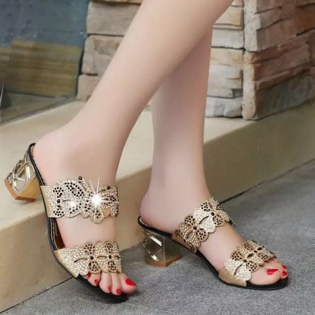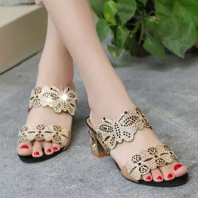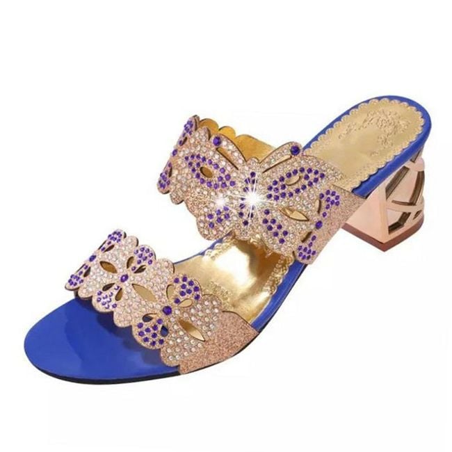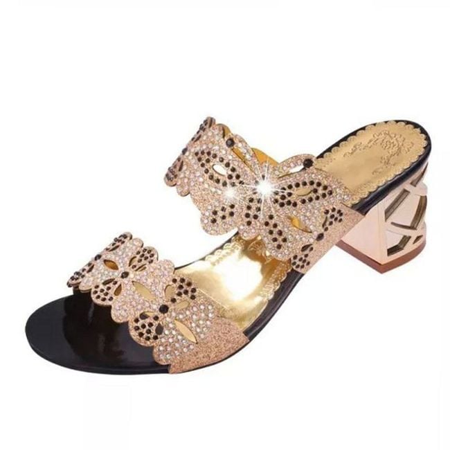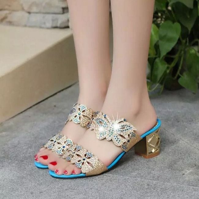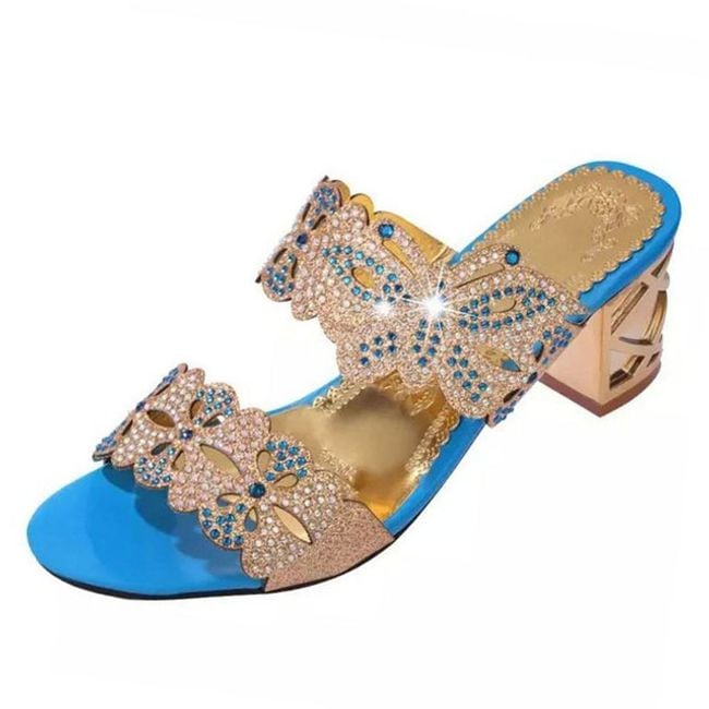 Stylish slippers are adorned with a large butterfly and embellished with numerous sparkling stones. They pair perfectly with skirts, dresses, and shorts.