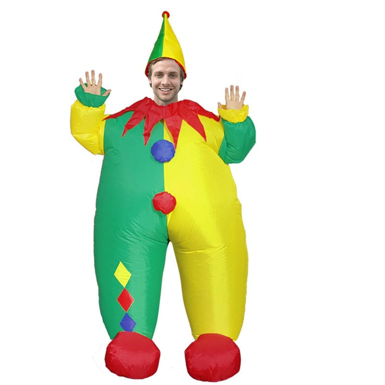 Cheerful Halloween clown costume. Universal size. Height 150 – 200 cm. Inflatable using a fan that is attached to the costume. The fan is powered by a USB cable or a battery charger (batteries not included).