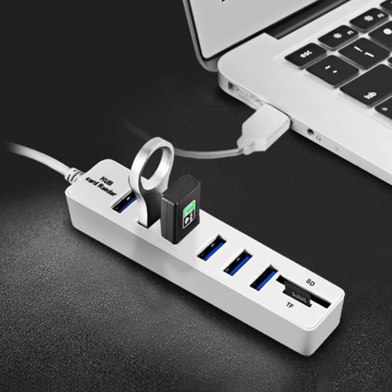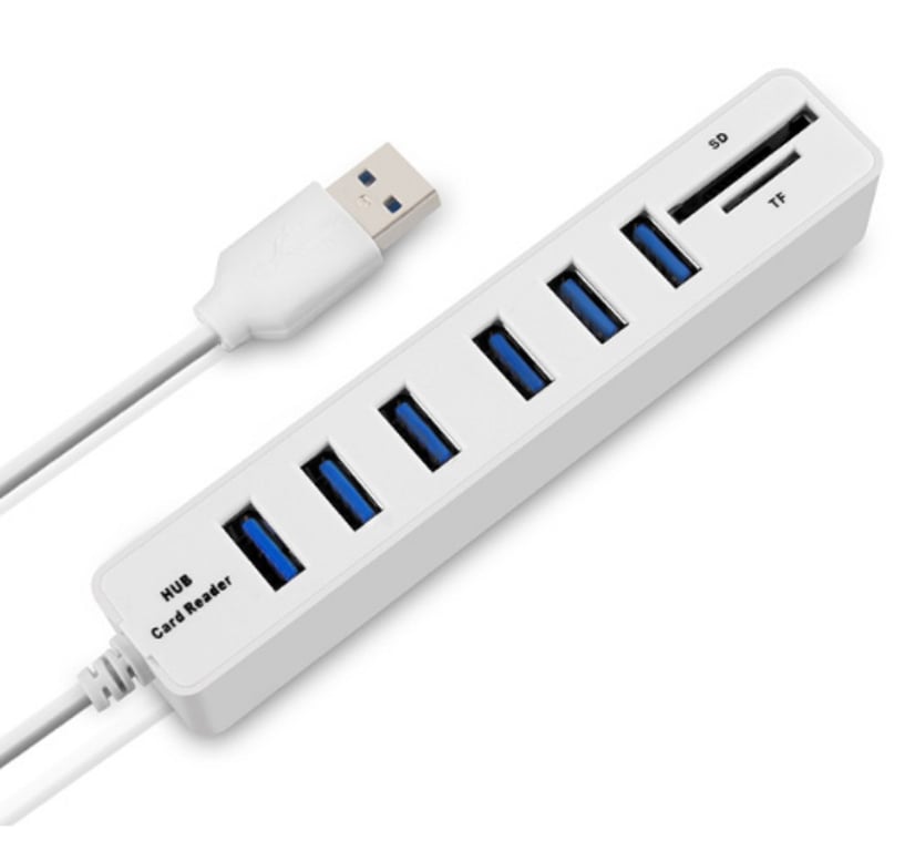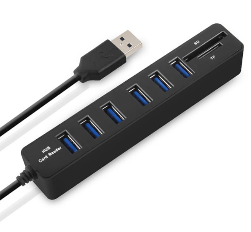 Expand your computer's connectivity with this 6-port USB 2.0 hub featuring an SD card reader.