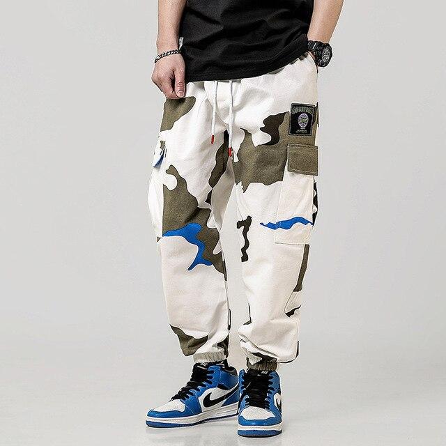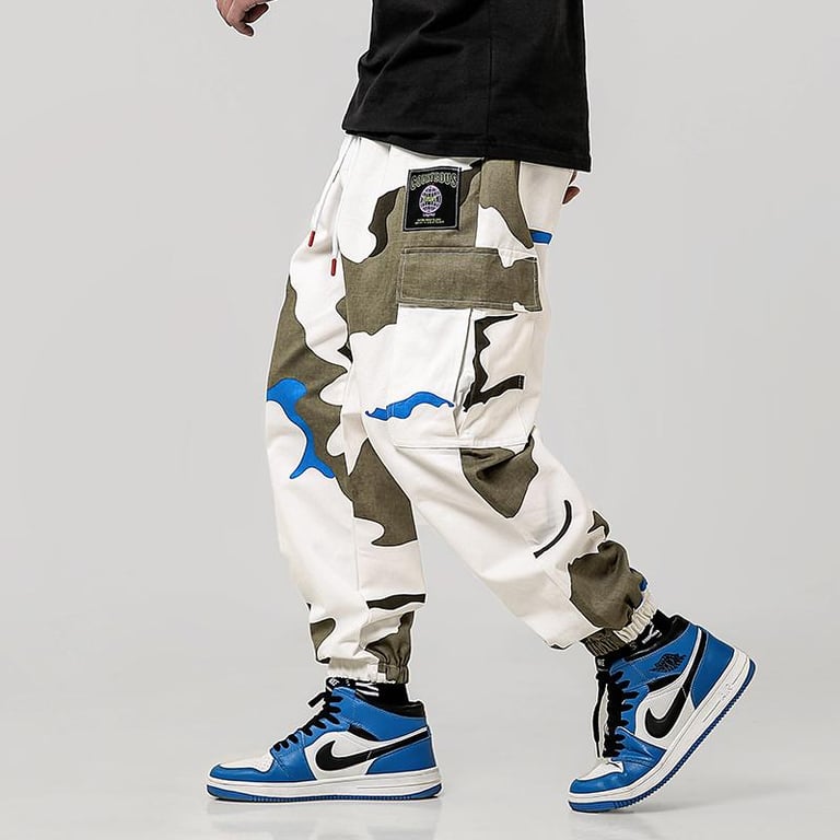 Loose-fitting cotton trousers with a camouflage pattern and embroidery on the leg. Elastic waistband with drawstring and cargo pockets.