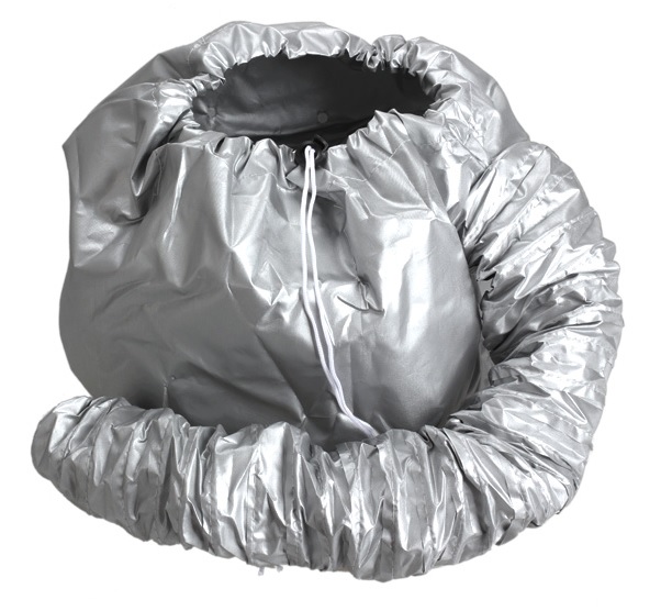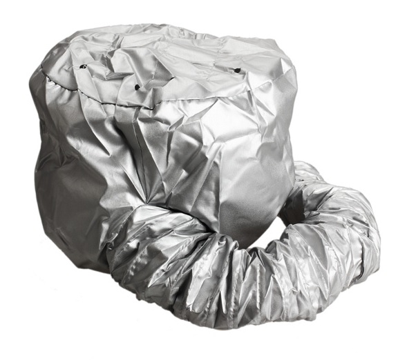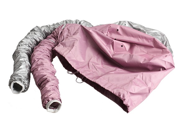 Put the hood on your head and tighten it with the drawstring. Attach the hairdryer to the end of the nozzle.