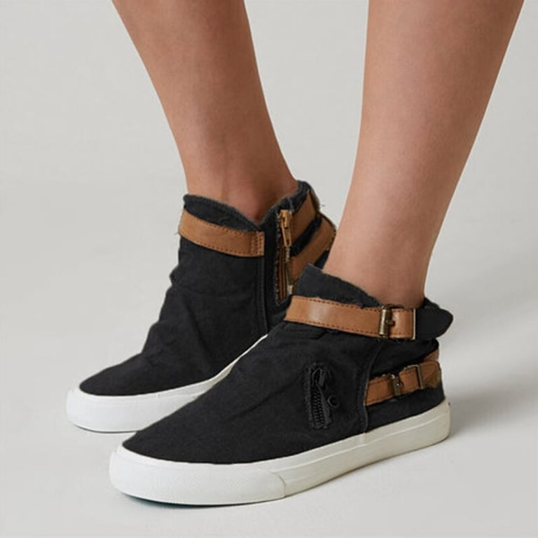 Women's ankle boots with a denim look. Flat rubber sole. Decorative faux leather buckles. Zip fastening on the inner side. Available in multiple colour options.