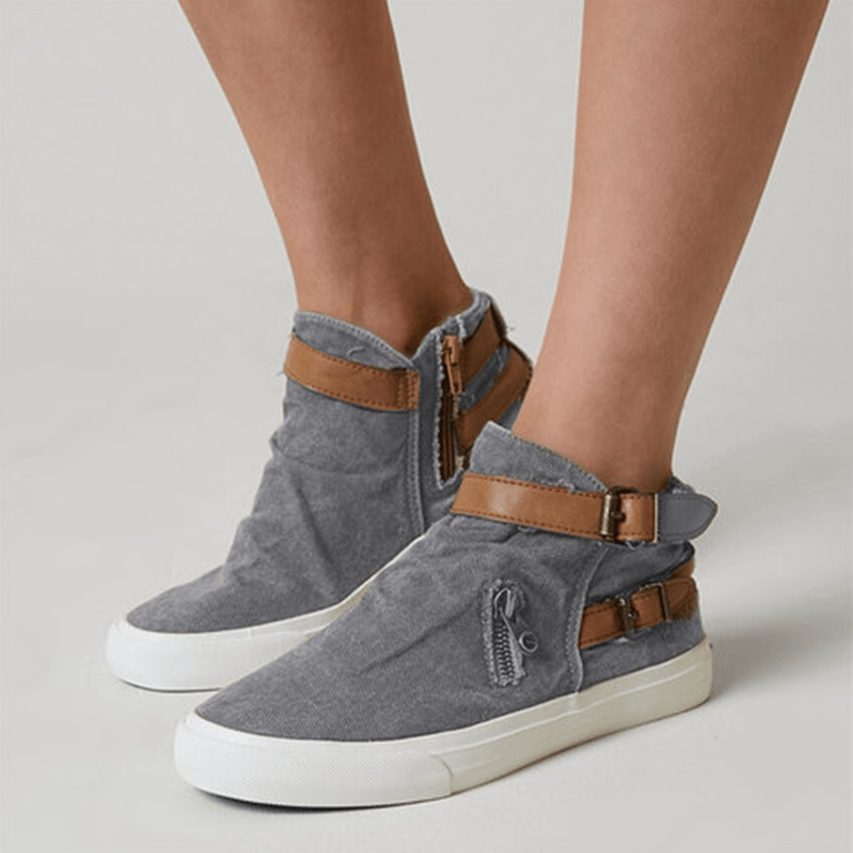 Women's ankle boots with a denim look. Flat rubber sole. Decorative faux leather buckles. Zip fastening on the inner side. Available in multiple colour options.