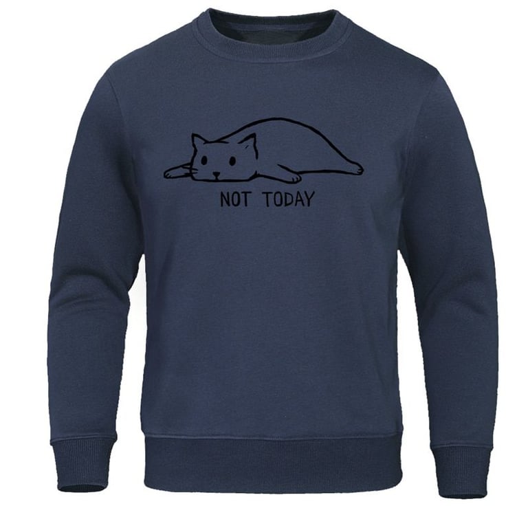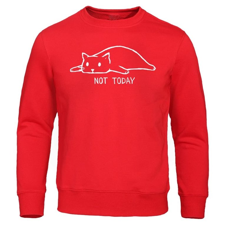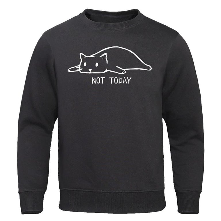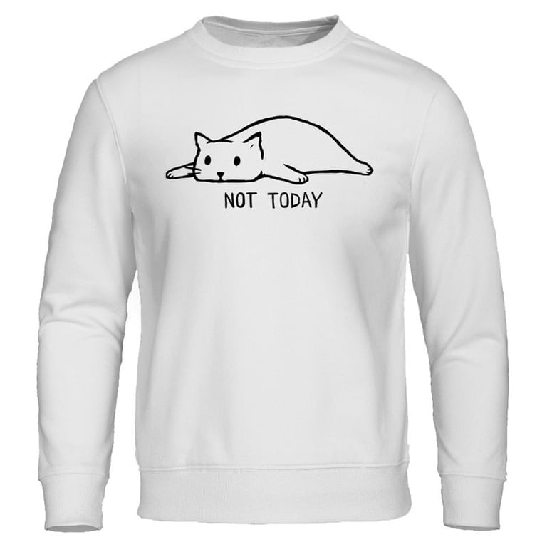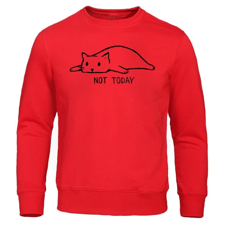 • – The sweatshirt features a print of a cat with the phrase “Not today”.