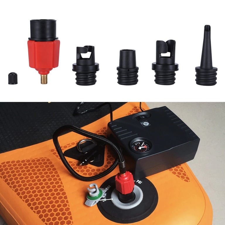 . Various nozzles as needed. Simply screw on the desired nozzle and you can start inflating.