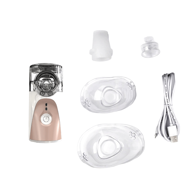 Package contents: 1x inhaler, 1x adult mask, 1x children's mask, 1x mouthpiece, 1x connecting head, 1x USB charging cable