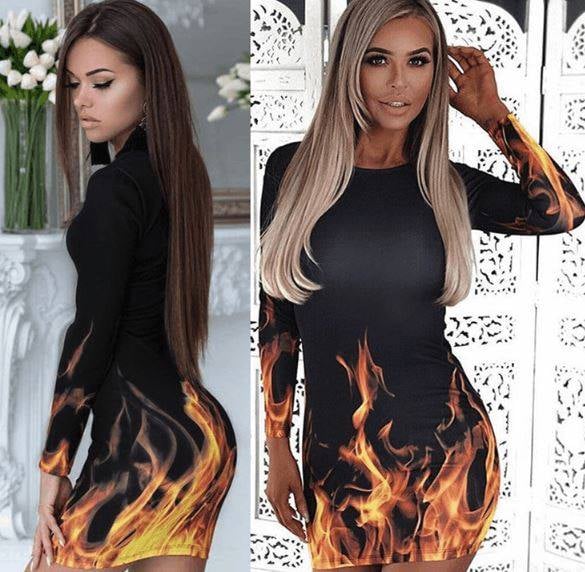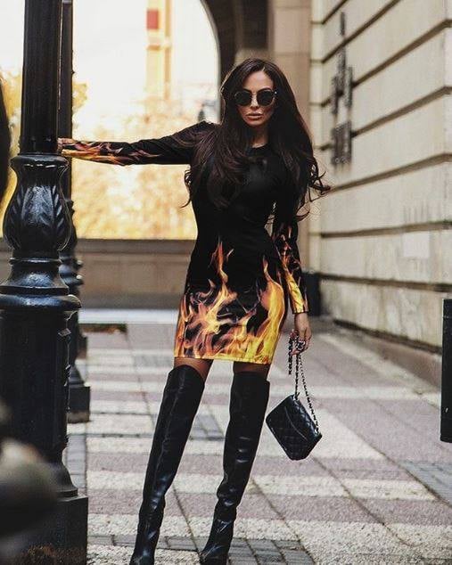 Interesting extravagant evening dress with a fire print.