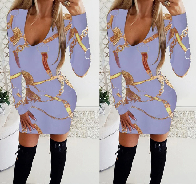 Interesting patterned shaping women's summer dress with long sleeves.