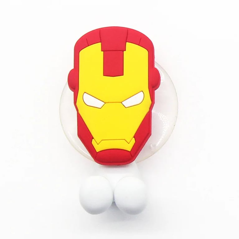 Iron Man children's toothbrush holder. The holder attaches to surfaces such as mirrors or tiles using a suction cup. Material: PVC