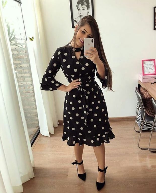 Elegant women's dress with a knee-length design. Adorned with ruffles and a bow at the waist.