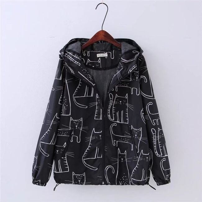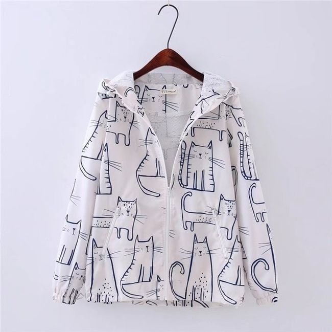The jacket comes in white or black and features a stylish print of cats all over, making it a very fashionable accessory for everyday wear during dreary weather.