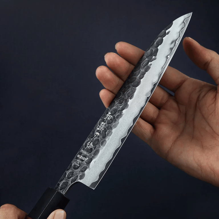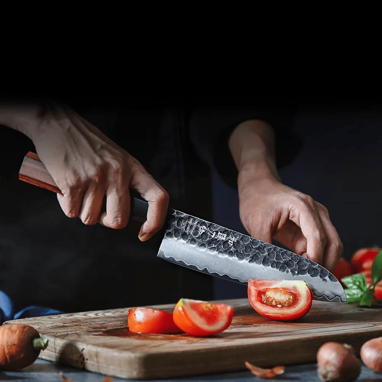 The Santoku knife is a masterful blend of traditional Japanese craftsmanship and modern design. Made from a 3-layer composite steel, it offers exceptional sharpness, strength and durability. The blade with a hammered texture not only catches the eye, but also prevents food from sticking while slicing.