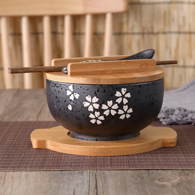 Traditional Japanese bowl with a wooden lid, chopsticks, and a spoon.