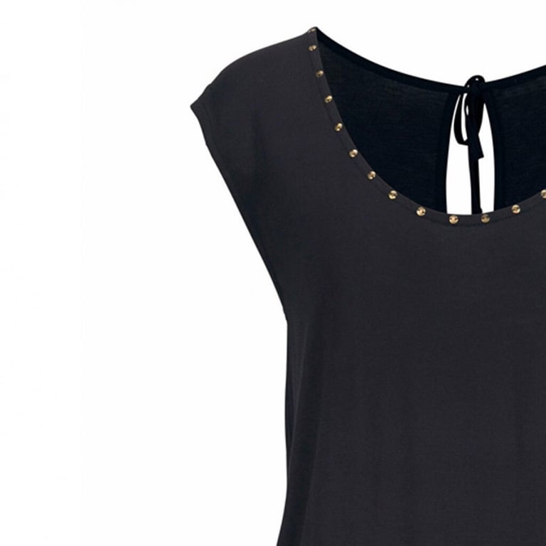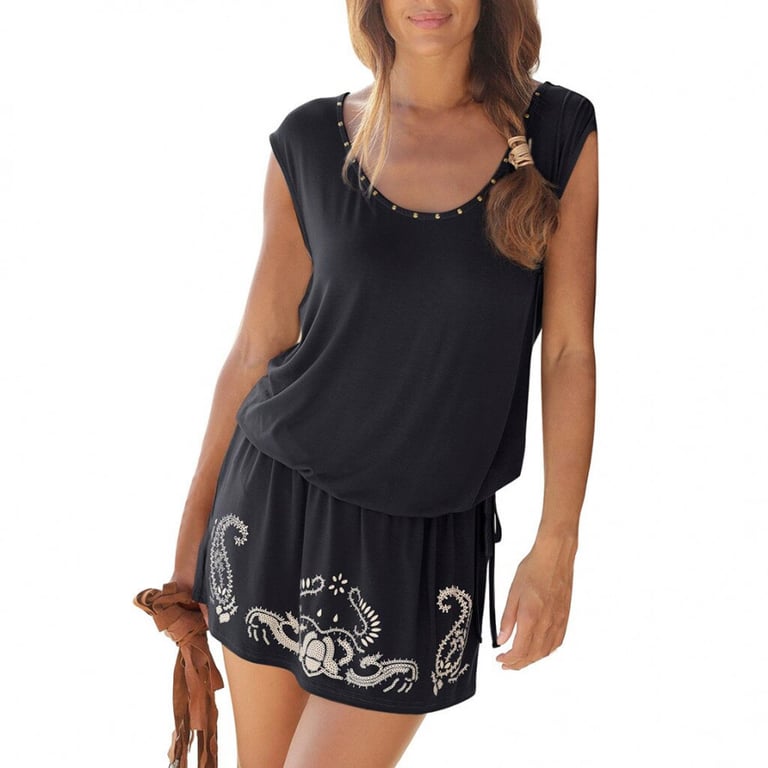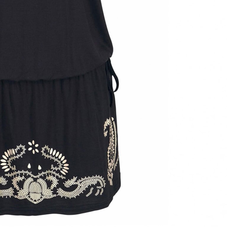 Women's summer dress with short sleeves and a round neckline. Loose fit with an elastic waistband. Available in two colour options.