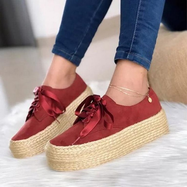 Women's trainers with satin laces. Round toe. Straw sole with a high platform. Available in multiple colour options.