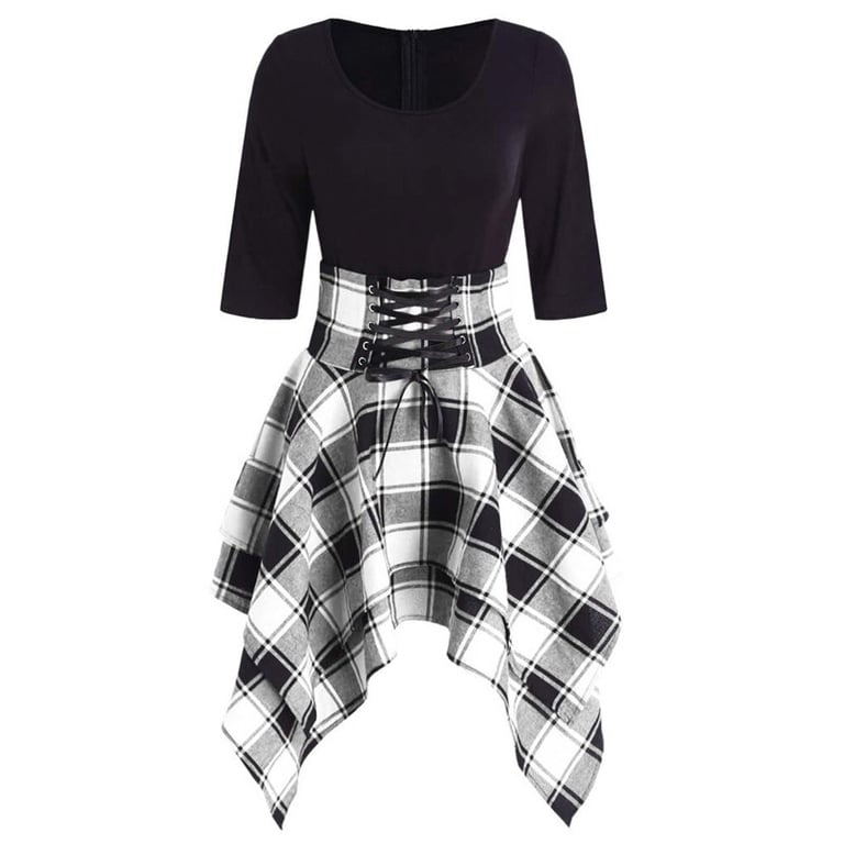 Designer dress in a shorter cut with a tie at the waist. Plaid pattern suitable for both formal and informal occasions.