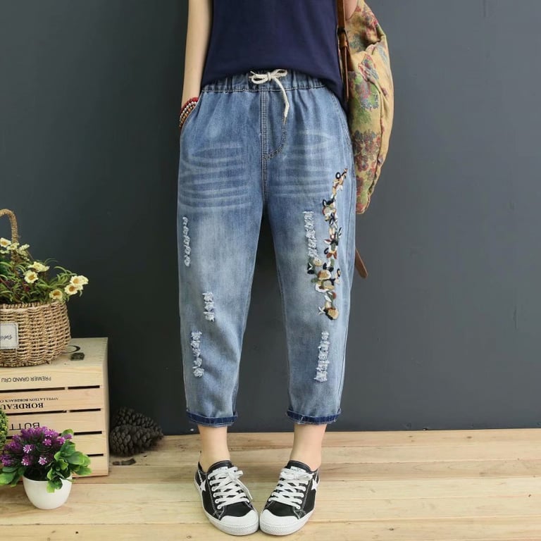 Women's boyfriend style jeans with an elasticated waistband. Wide rolled-up legs. Embroidery with various motifs. Available in multiple options.