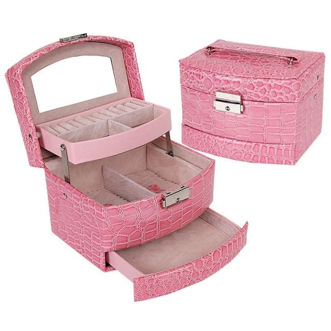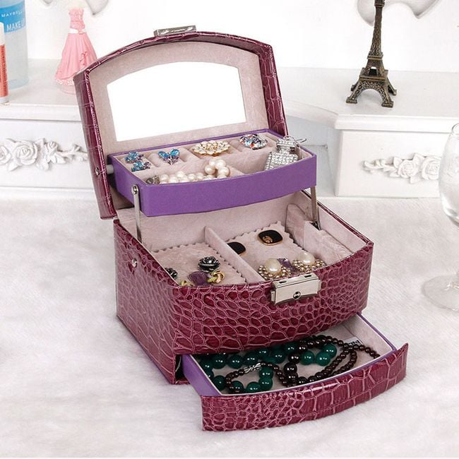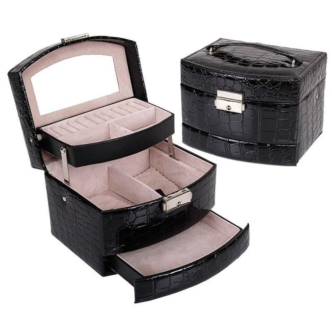 The jewellery box is three-tiered, made of artificial leather, has a snake pattern, and is suitable for any jewellery.
