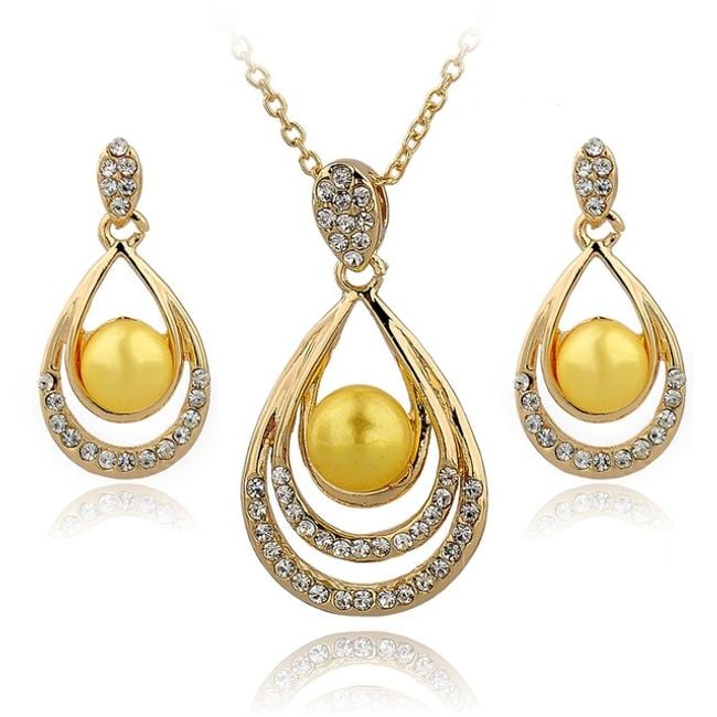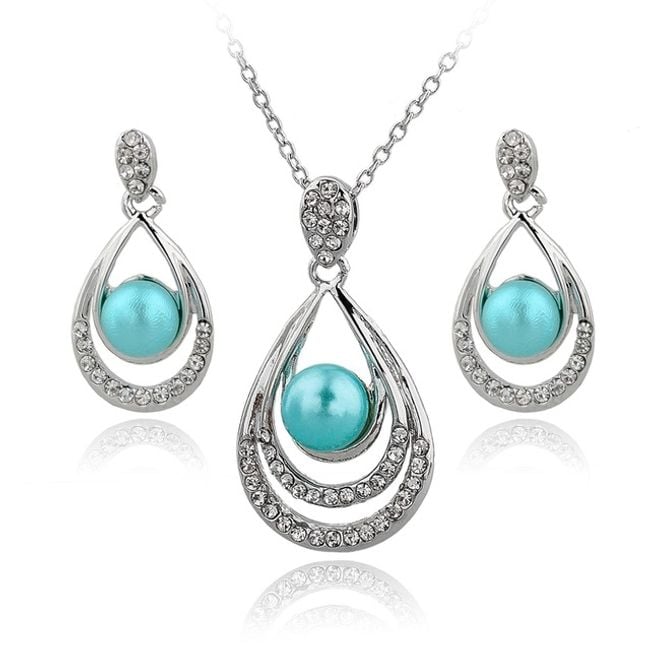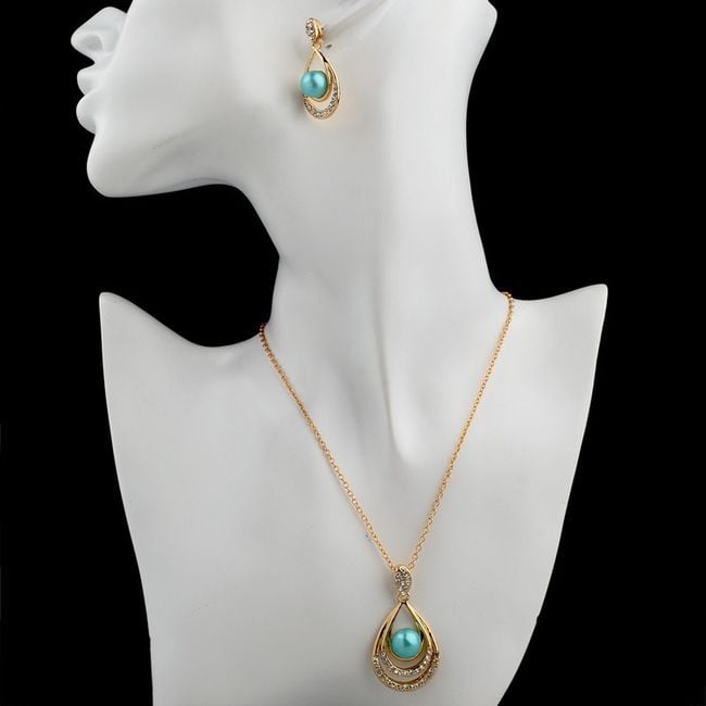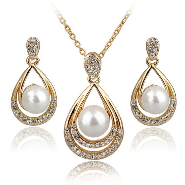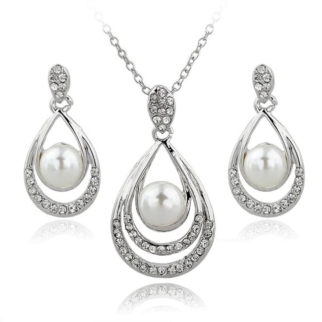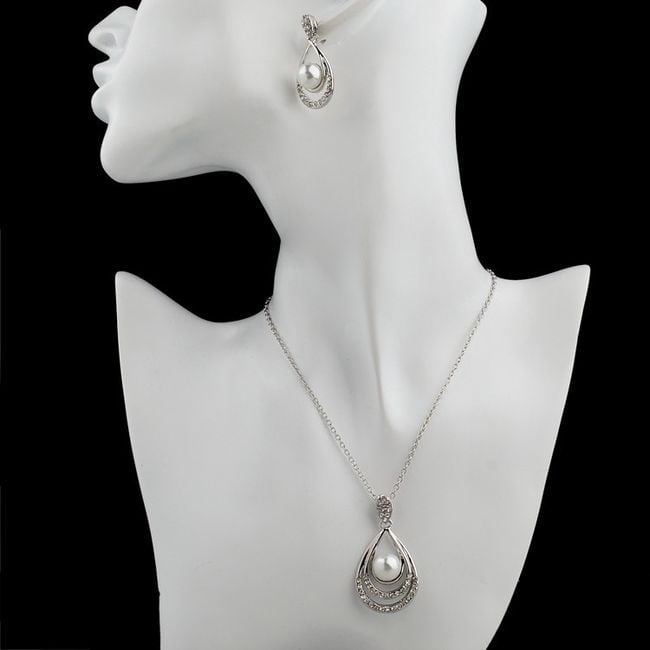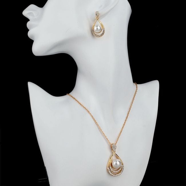 The jewellery set includes a necklace and earrings – the pendant of the necklace and the earrings are in the shape of a teardrop, with the centre made of an artificial pearl.