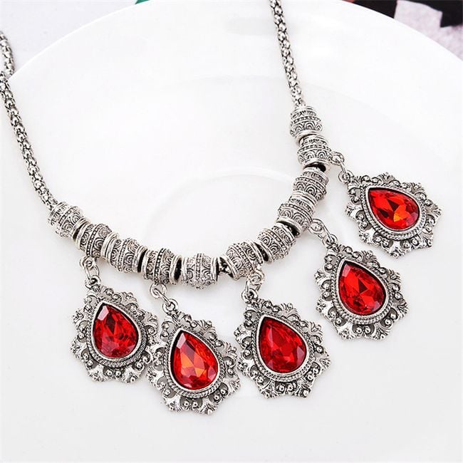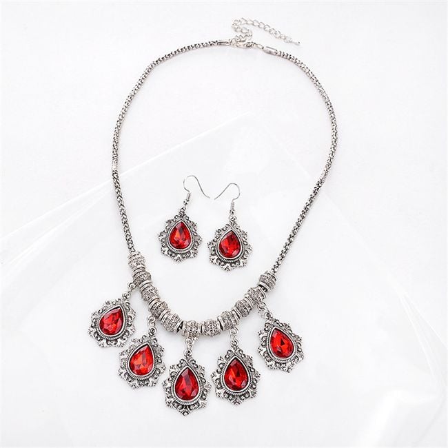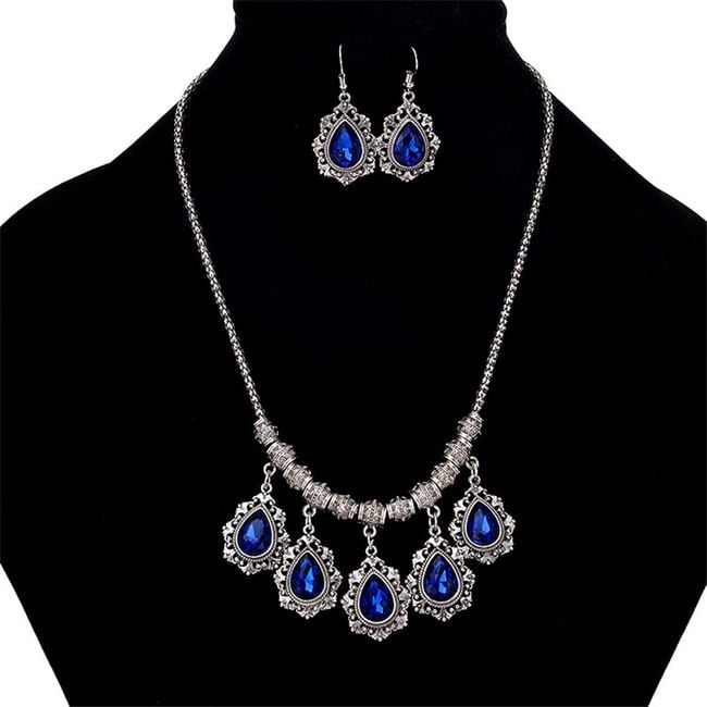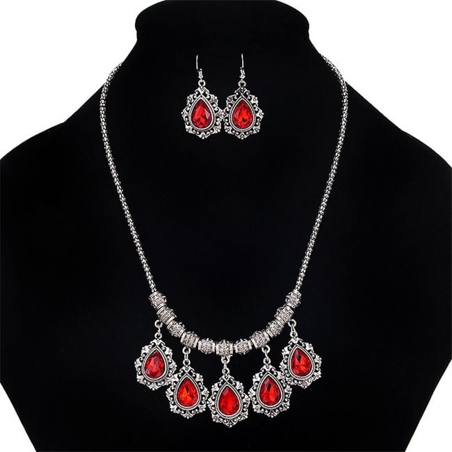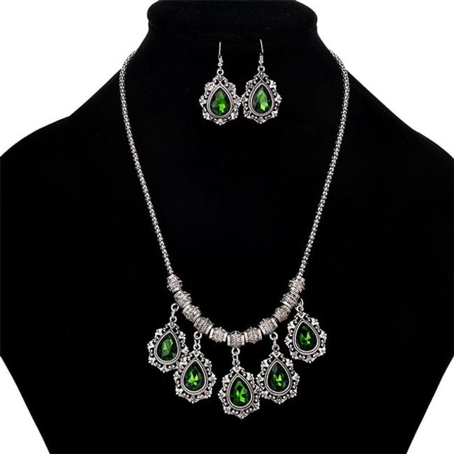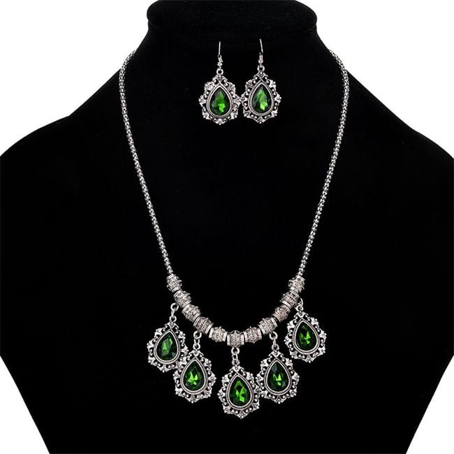 It is important for the jewellery to match – this set will save you the effort. Both the necklace and earrings are adorned with drop-shaped stones.