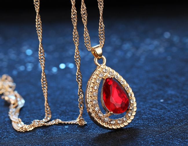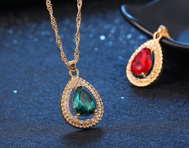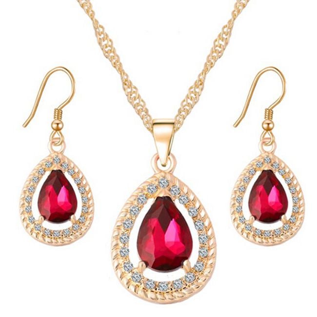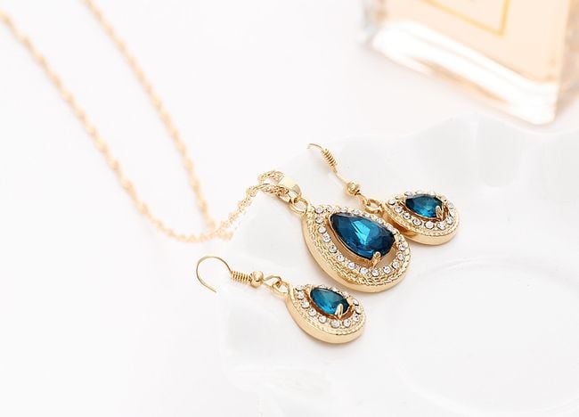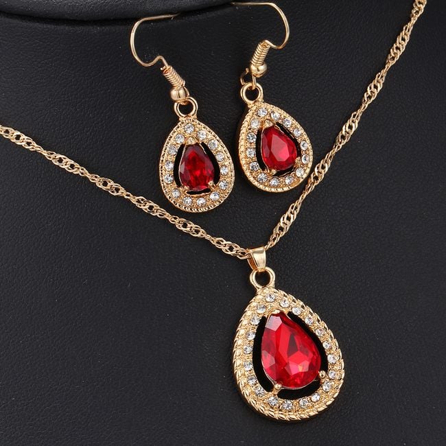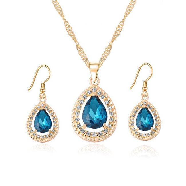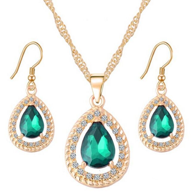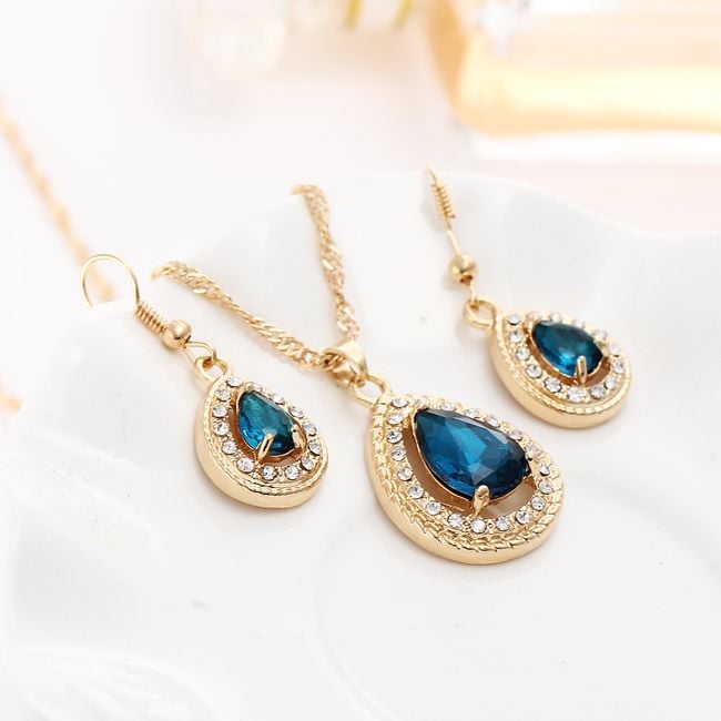 The jewellery set includes a necklace and a pair of earrings. They are adorned with colourful and sparkling stones. You can choose from several colours.