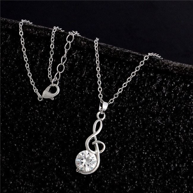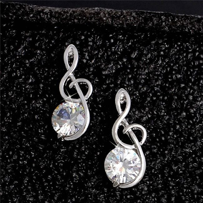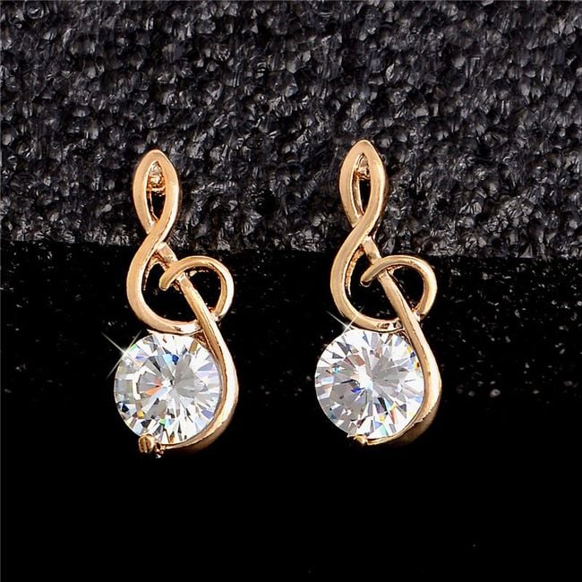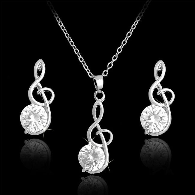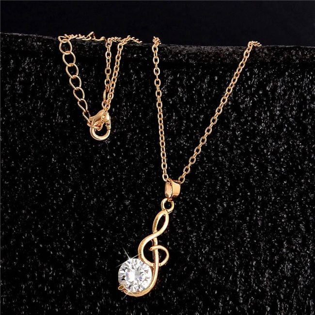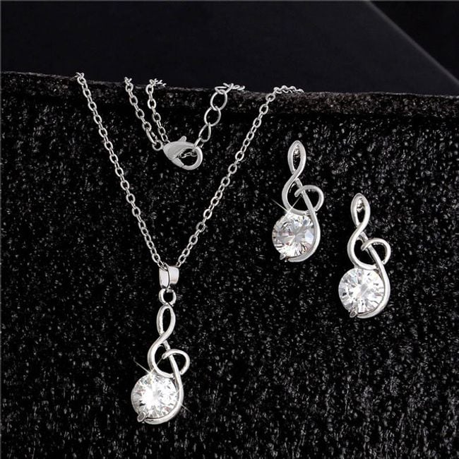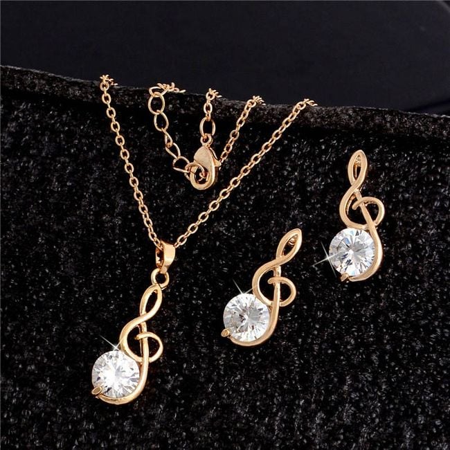 The necklace and earrings featuring a treble clef design are available in both gold and silver colours.