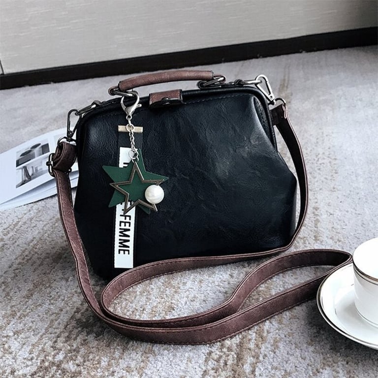 Women's briefcase handbag with a charm, featuring a handle for hand carrying and a long adjustable shoulder strap. Leather look. Available in multiple colour options.