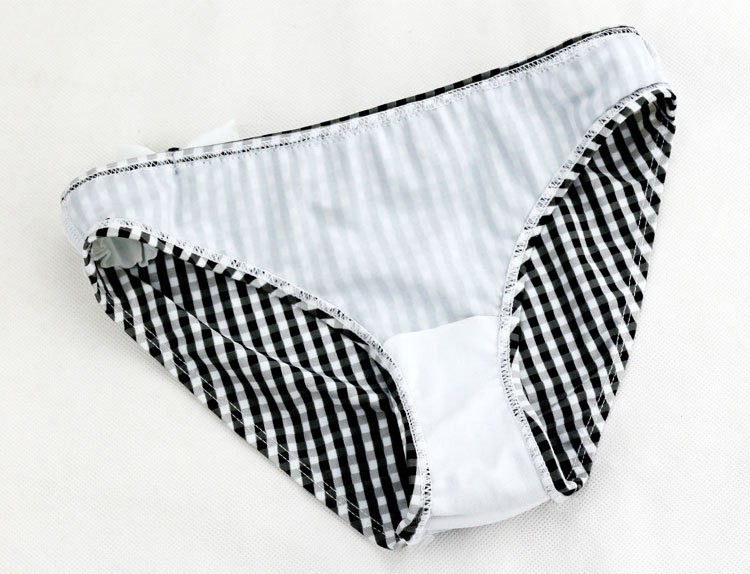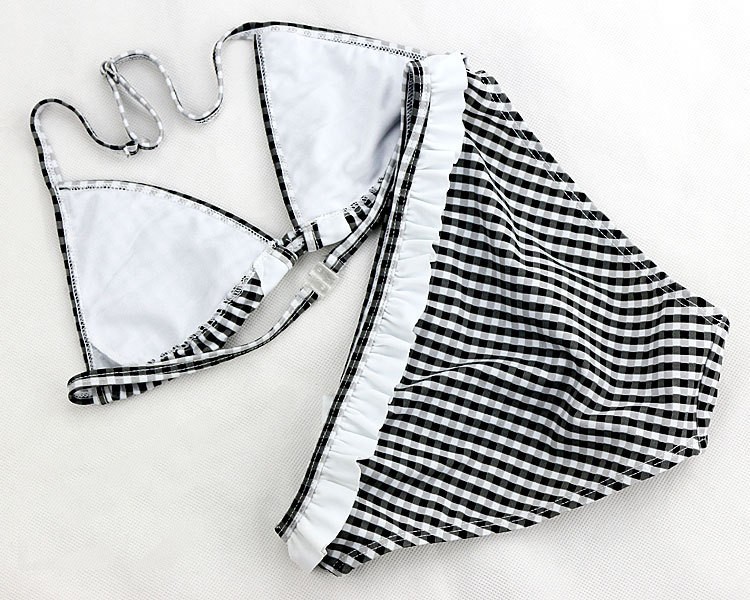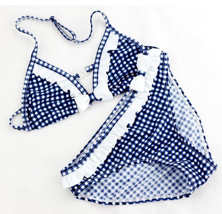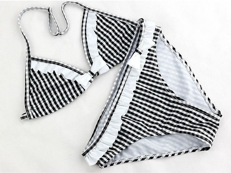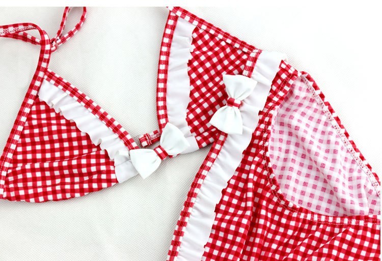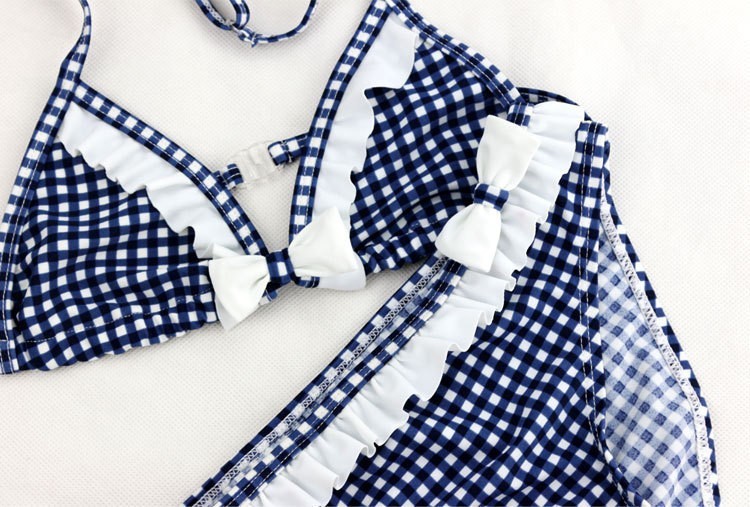 The swimsuit is a two-piece set with a checkered pattern and a small bow in the centre of the cups.