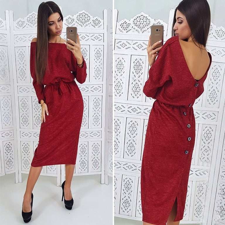 Women's long-sleeve dress. The dress features a V-neck at the back and a tie belt at the waist. Button fastening at the back. Available in several colours.