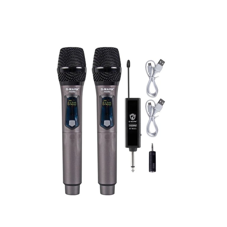 Package Contents: 2x microphone, 1x receiver/transmitter, 2x charging USB cable, 1x adapter