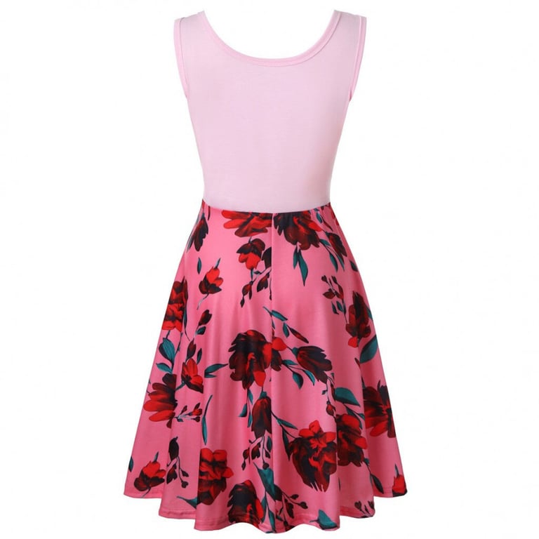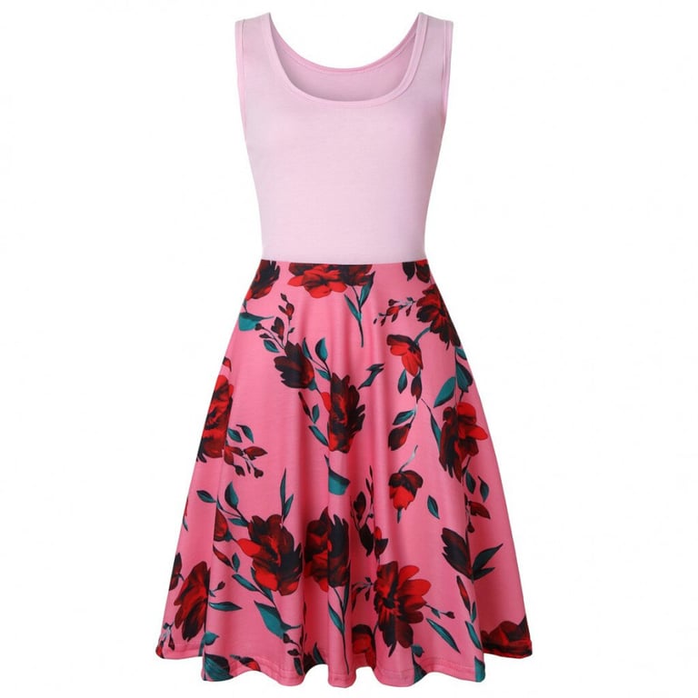Women's lightweight dress with a sleeveless tank top and a round neckline. Short A-line skirt with a colourful floral pattern.
