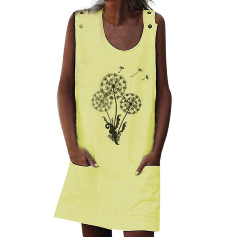 Women's summer sleeveless dress. Short loose fit with a round neckline and front pockets. Print on the front. Available in multiple colour options.