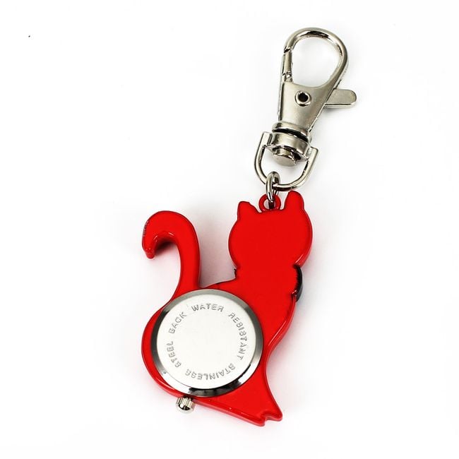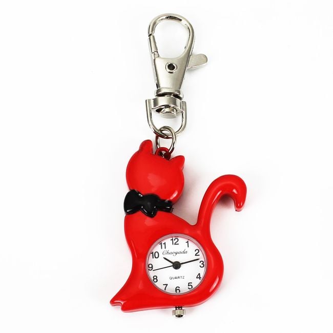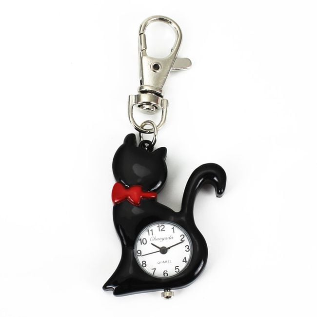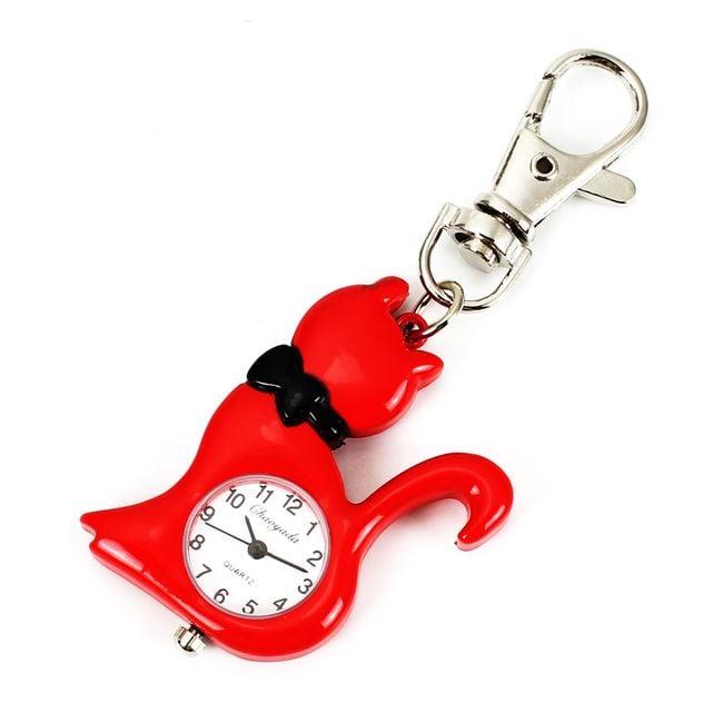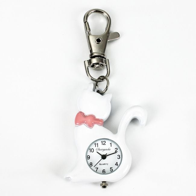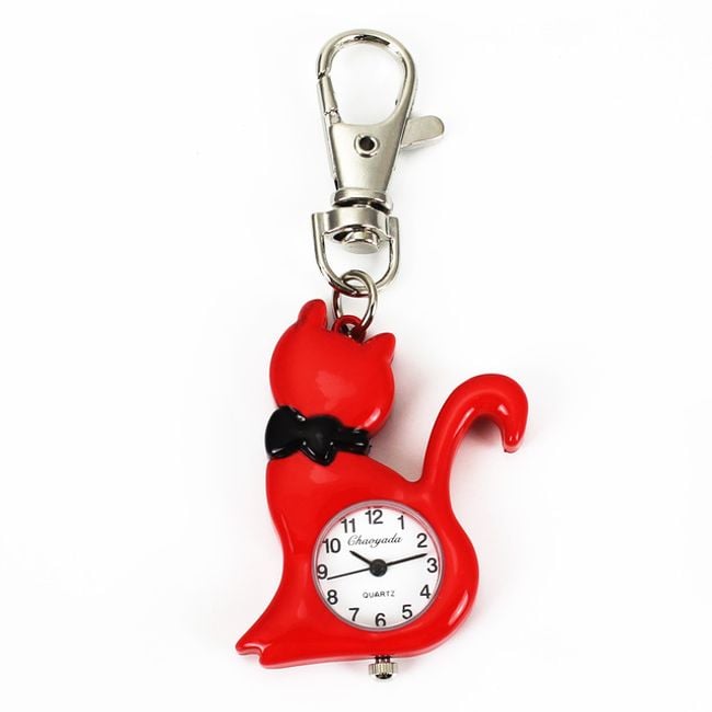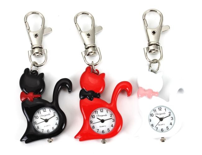 The keychain features a clock with a kitten. Choose from 3 colours.