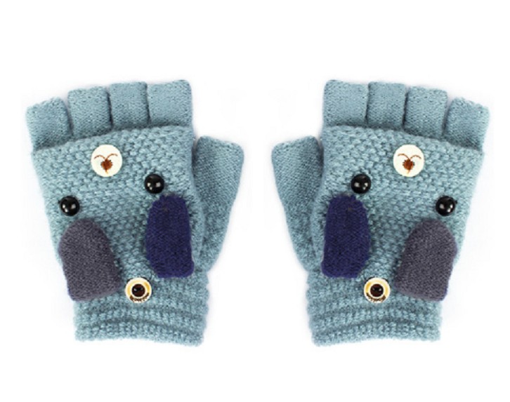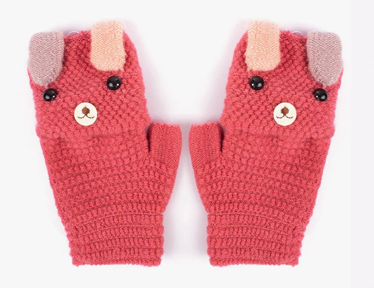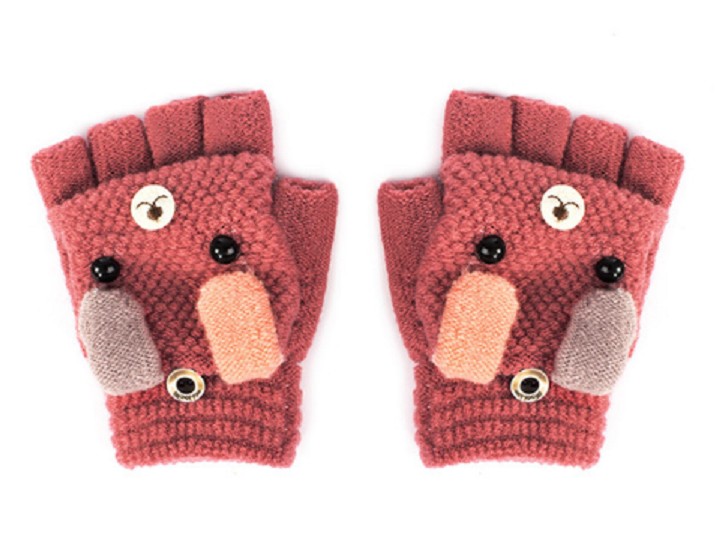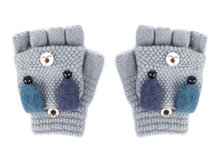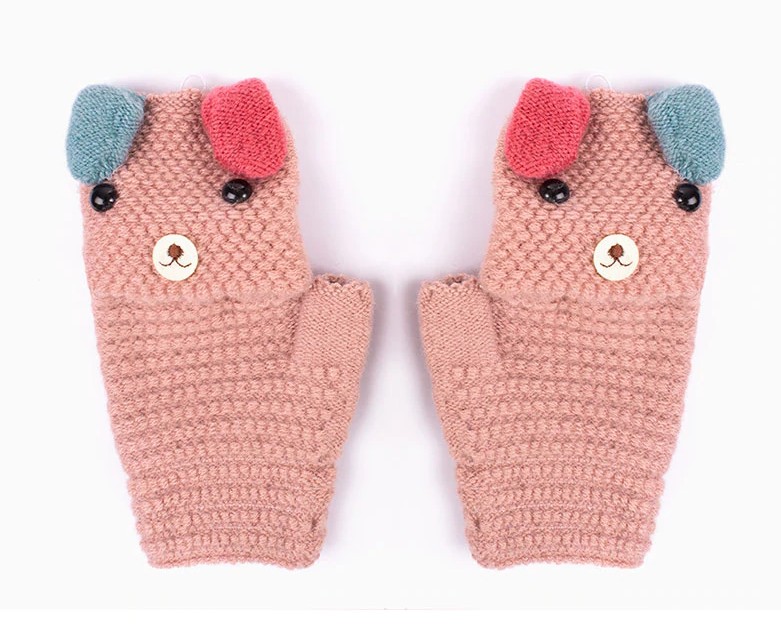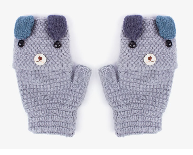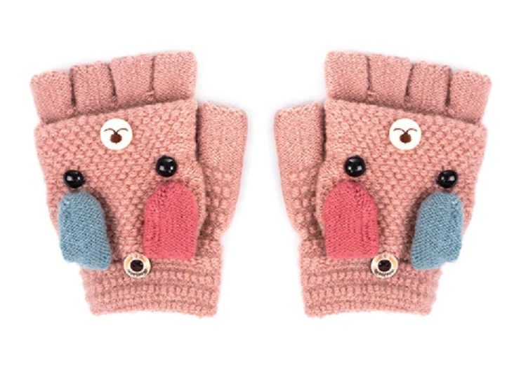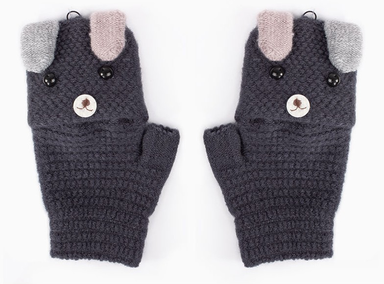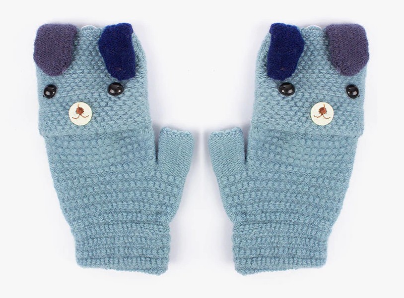 These beautiful fingerless gloves can be folded into mittens. A dog is depicted on the gloves.