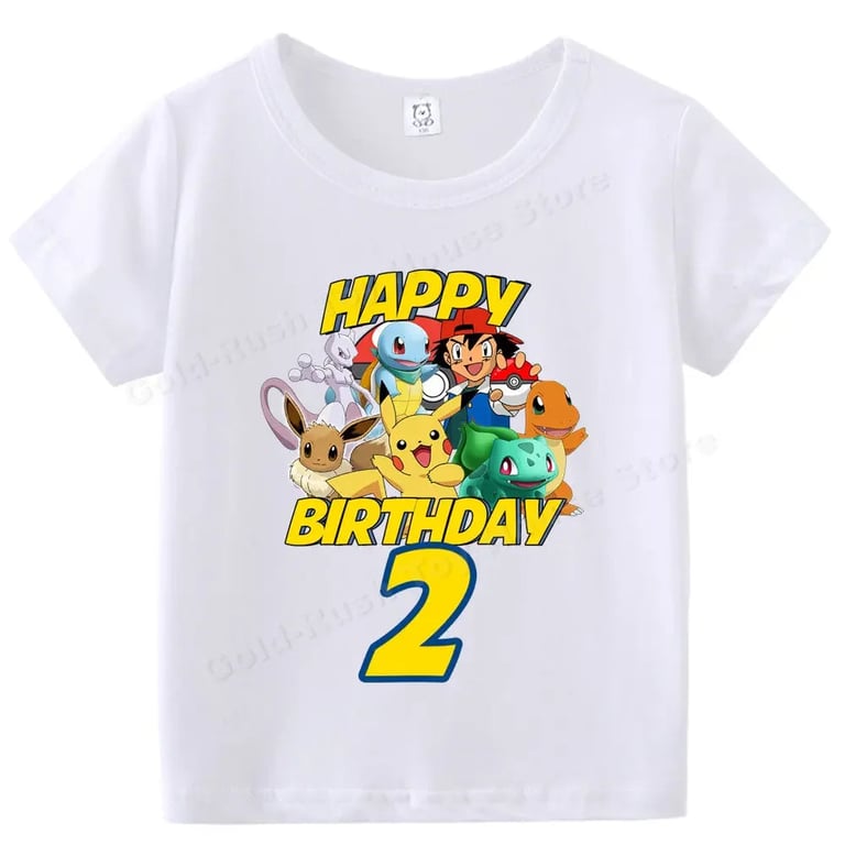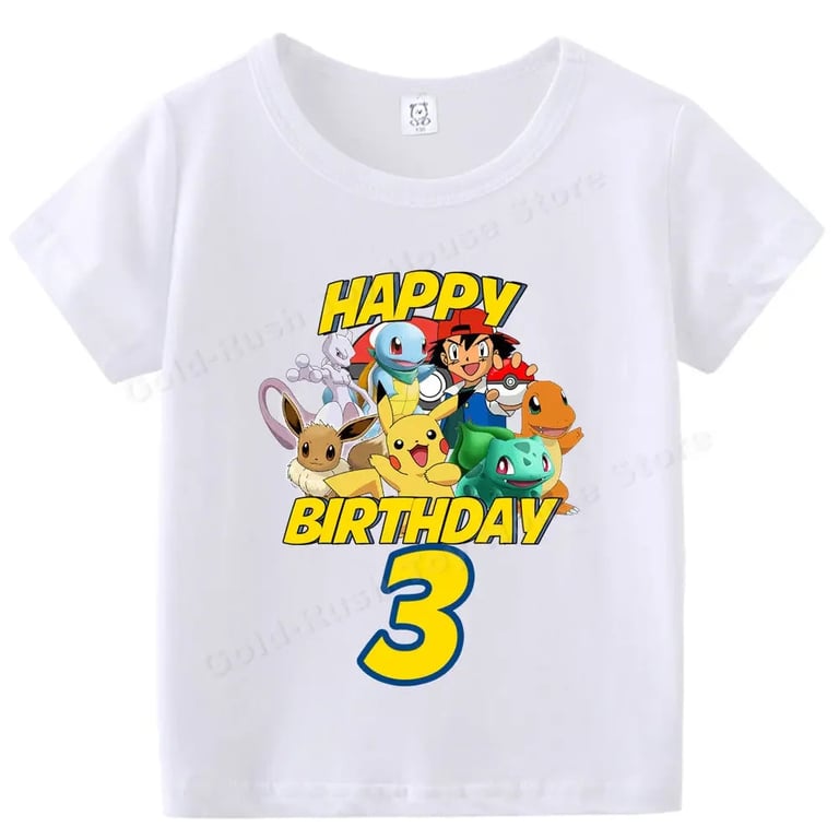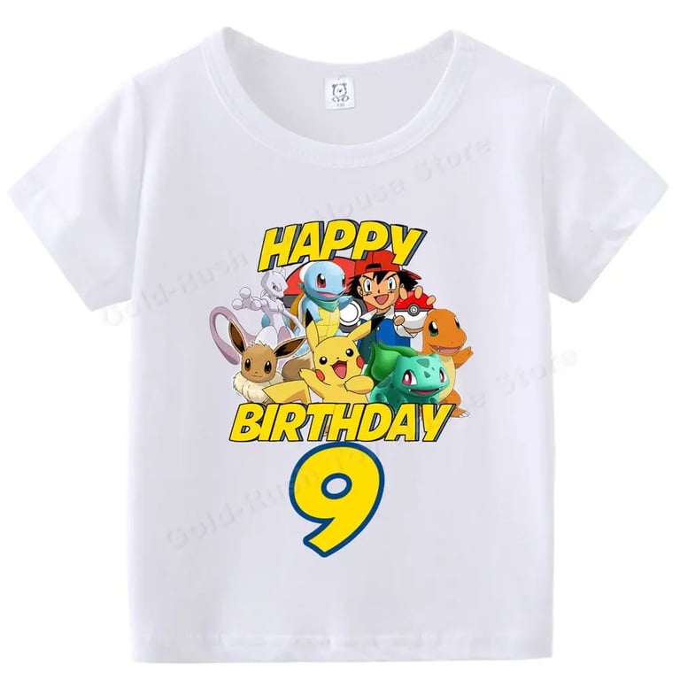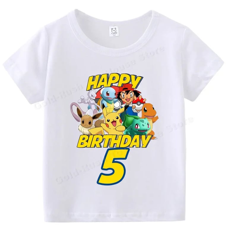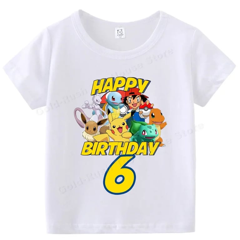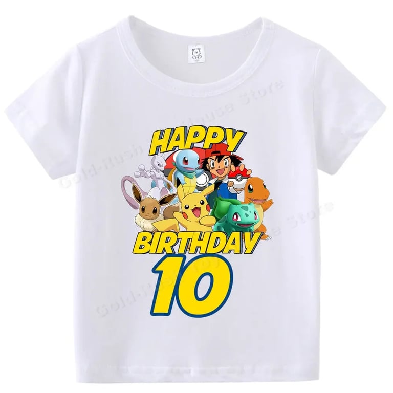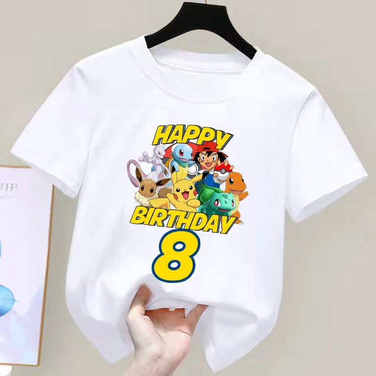 Kids' white birthday T-shirt with a Pokémon number. Material: 70% polyester, 30% cotton Size chart (cm) Size 100: T-shirt length 43 cm; Chest circumference 60 cm Size 110: 45 cm; 62 cm Size 120: 47 cm; 66 cm Size 130: 50 cm; 68 cm Size 140: 53 cm; 72 cm Size 150: 56 cm; 76 cm Size 160: 59 cm; 84 cm