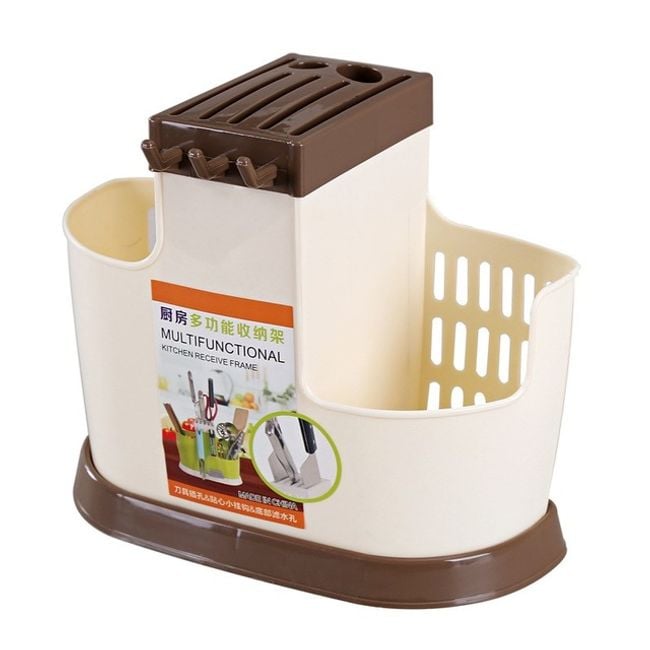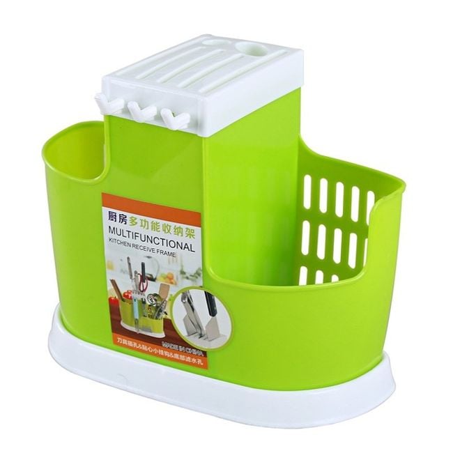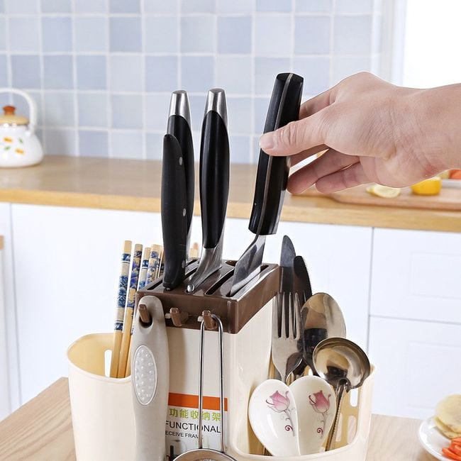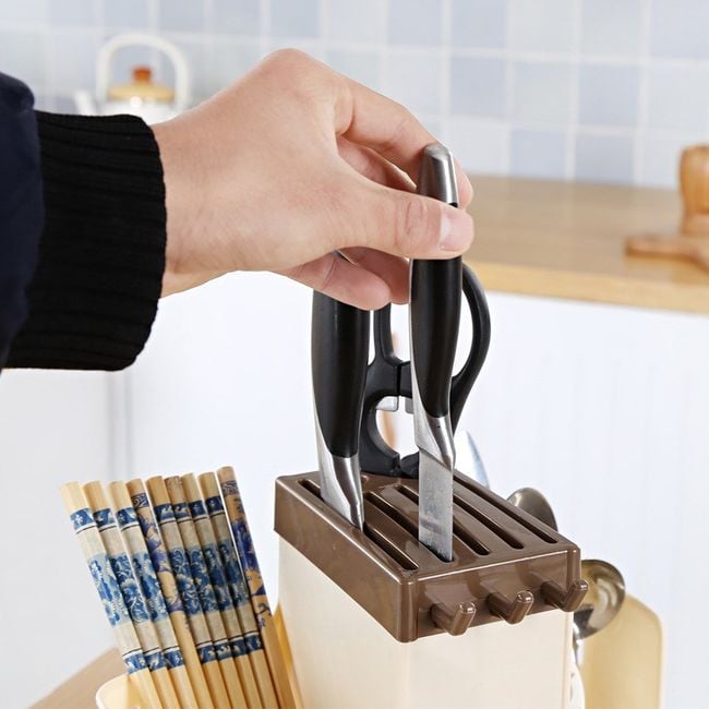 Stand for knives, spoons, and other kitchen utensils! It consists of a knife stand, has 2 openings on the sides and 3 practical hooks at the front. You can choose it in 2 colours!