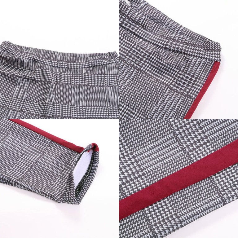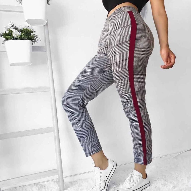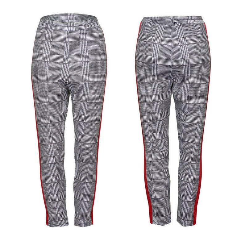 Women's elegant casual trousers in grey with a coloured stripe on the side. Checked pattern. Elastic, with a drawstring waist. Available in two variants.