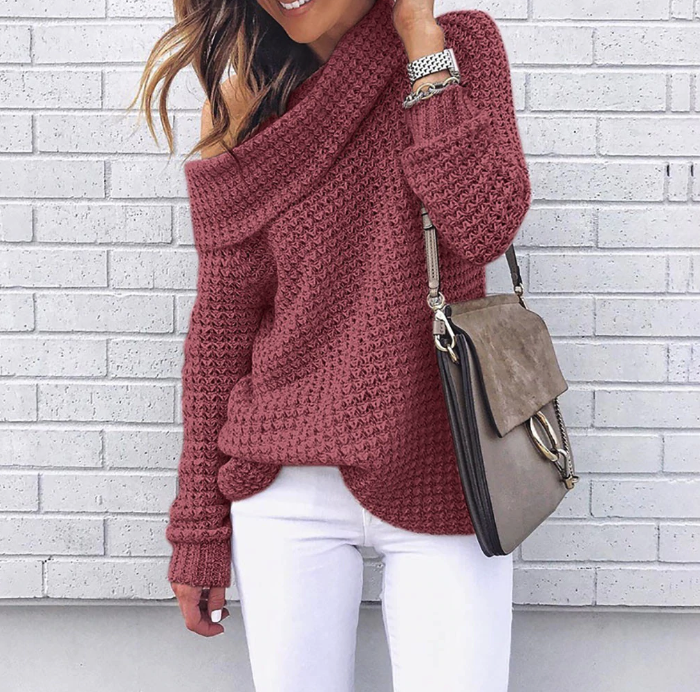 Knitted asymmetric autumn women's sweater with a collar.