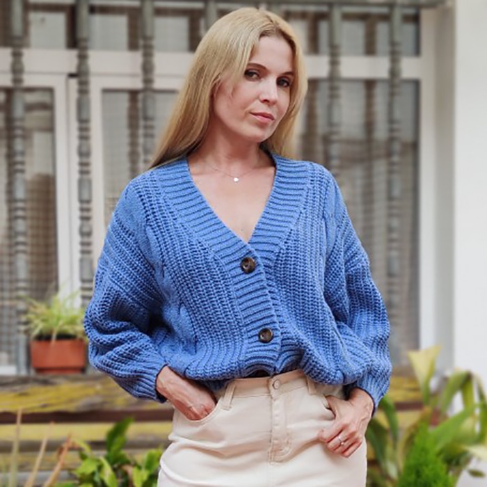 An informal knitted warm sweater with large buttons. It features a trendy cut and a V-neck. It will surely keep you warm on chilly days.
